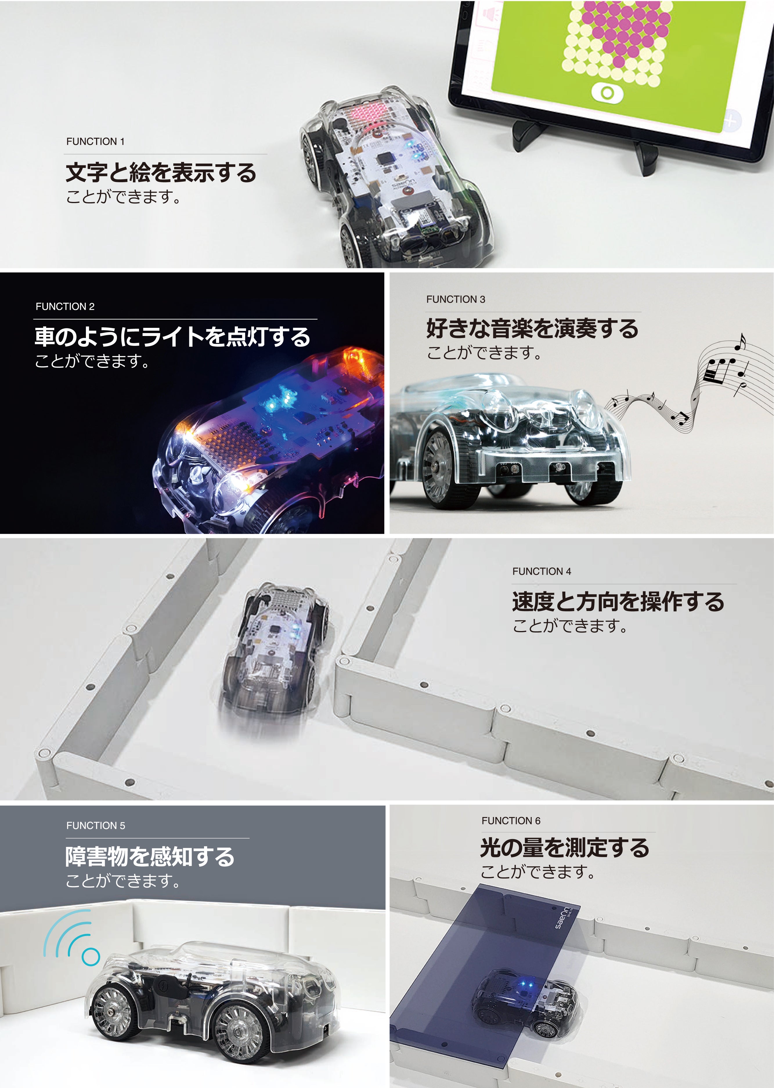 ;走る、止まる、ハンド裁き、ライト、音楽、絵文字の表示、赤外線センサー、照度センサー、などのコントロールの練習