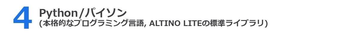 小学生~大人を対象とする、1991年にオランダ人のグイド・ヴァン・ロッサム氏によって開発されたプログラミング言語で、読みやすく書きやすいシンプルな文法が特徴で、初心者でも習得しやすい言語とされています。オープンソースで開発されており、多くのプラットフォームで利用できます。ALTINO LITE専用のモジュールを設定し、パイソンにてALTINO LITEをプログラミングします。パイソンは高校の情報Ⅰ~情報Ⅱで使用されています。
