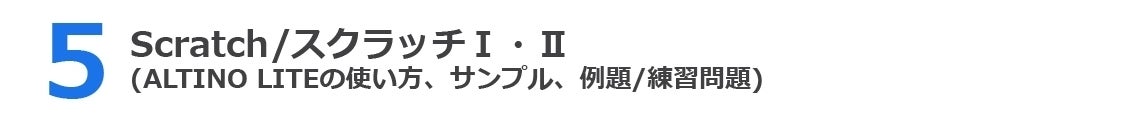 小学生~高校生を対象とする、ブロックプログラミング言語です。スクラッチは、アメリカ・マサチューセッツ工科大学のメディアラボが無償で公開しているビジュアルプログラミング言語で、画面上のブロックをつなぎ合わせてプログラムを作ります。日本語でも使用可能で主にマウスを使用するため、キーボード操作に不慣れな小学生でも利用することができます。ALTINO LITE専用のモジュールが追加されたスクラッチをダウンロードし使用します。