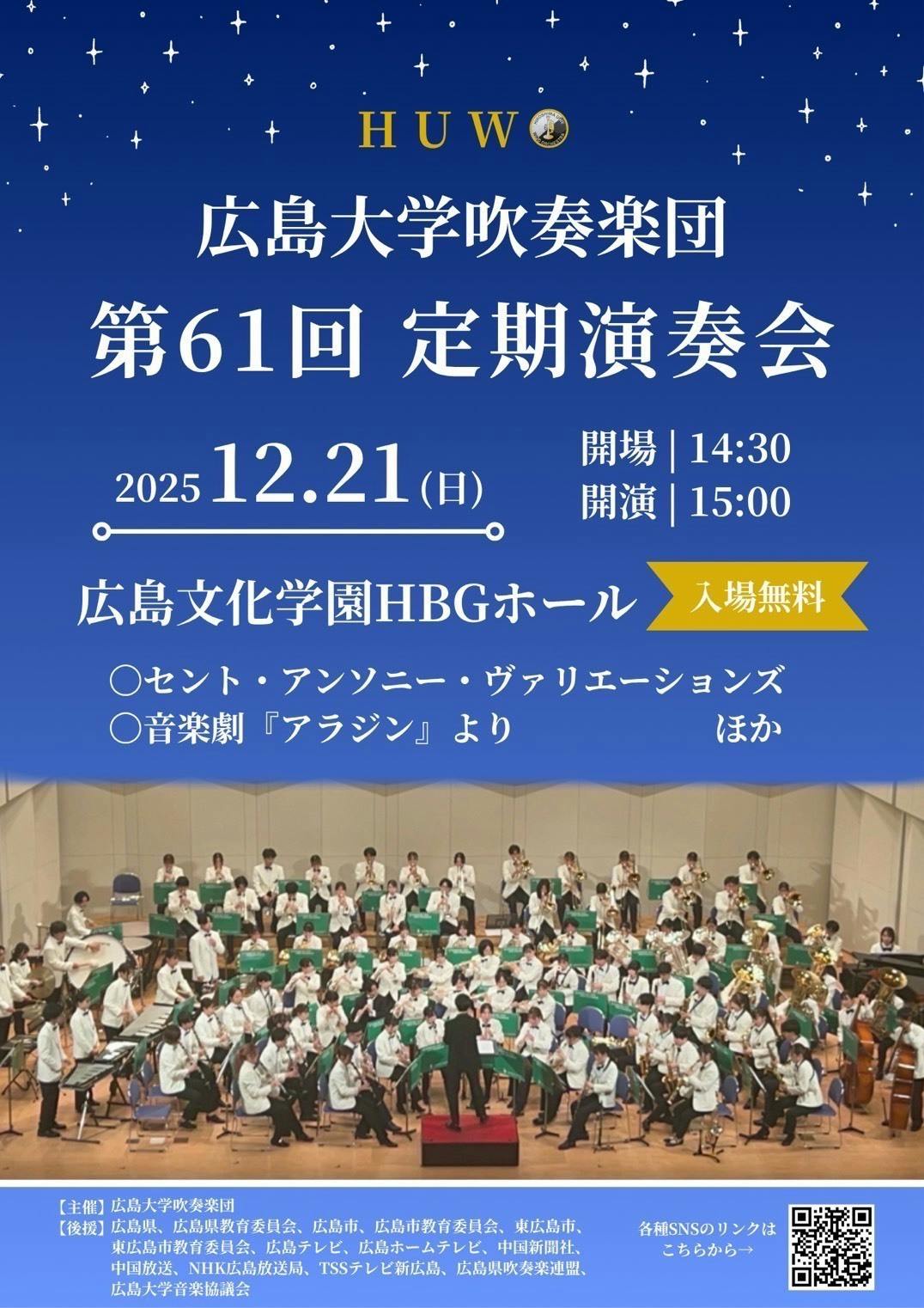 2025/11/24 15:23来る12月21日、広島大学吹奏楽団第61回定期演奏会を広島文化学園HBGホールにて開催いたします。今年の集大成として、第一部 クラシックステージ第二部 ポップスステージの2部構成でお届けいたします。第一部では、100名規模ならではの大迫力のサウンドに加え、今年度の自由曲である「永劫の翼 ~ジョン・フレミングの法則」も演奏いたします。第二部では、音楽劇 「アラジン」 をはじめ、広島大学オリジナルメドレーなど、皆さまに楽しんでいただけるようなプログラムをご用意しております。現在、団員一同、定期演奏会に向けて全力で準備中です!ぜひお誘いあわせのうえ、お越しください!また、本プロジェクトのリターンである優先入場もご利用いただけます。県内外問わず、多くの皆さまのご来場を心よりお待ちしております! もっと見る