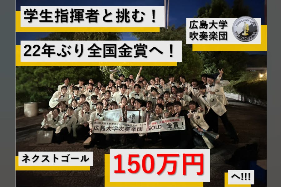2025/12/01 11:49クラウドファンディングが終了いたしました。この度は 225名もの皆さまから、総額1,350,000円 ものご支援を賜りました。団員一同、心より感謝申し上げます。学生運営の私たちにとって、この挑戦がこれほど多くの方に支えられていることを、今回のプロジェクトを通して強く実感いたしました。全国大会という大きな舞台で、皆さまに応援していただけるようなバンドとして活動できたこと、そしてそんな仲間たちと全国に挑めたことを、本当に誇りに思います。クラウドファンディングという新しい取り組みには不安もありましたが、多くの方と繋がり、温かい応援をいただき、「挑戦して本当に良かった」と心から感じています。改めまして、本プロジェクトへの応援・ご支援、本当にありがとうございました。現在、リターンの準備を進めておりますので、今しばらくお待ちいただければ幸いです。そして 12月21日(日) の定期演奏会 では、今年のチームの集大成を皆さまにお届けできるのを楽しみにしております。ぜひ会場へお越しください!2025年12月1日広島大学吹奏楽団団長 益吉翼 もっと見る