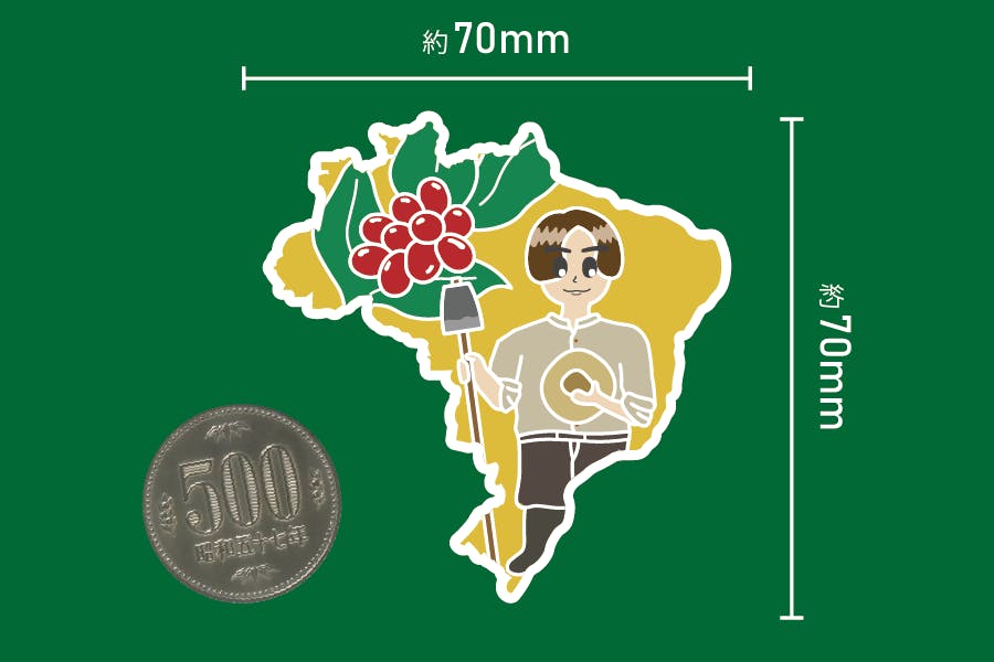 デザインのイメージは。ブラジルの全国地図の中に、コーヒーの実と日本人移民をイメージしたキャラクターを描いています。