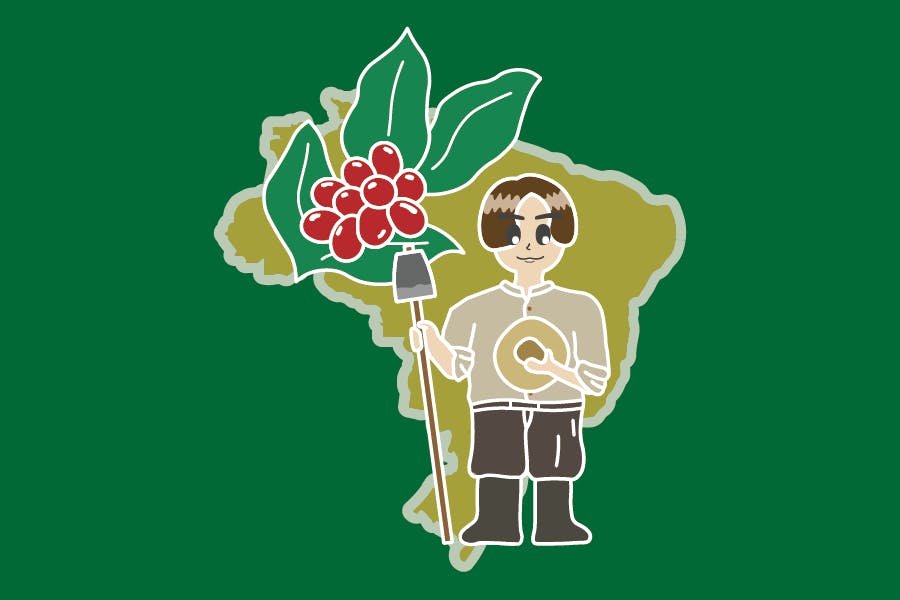 日本人移民の多くはコーヒー農園や綿農園で働いていました。その大半はコーヒー農園に従事していたので、コーヒーの実を描かせていただきました。また、日本人移民のキャラクターはコーヒー農園での服装をイメージしております。長袖のノーカラーシャツに、長靴。そして右手には、コーヒー農場の手入れに使われていたクワを描いています。