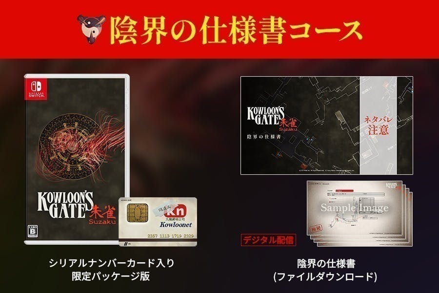 Nintendo Switch版『クーロンズゲート Suzaku』を、限定パッケージ仕様でお届けします。シリアルナンバー入り“Kowloonet”アクセスカードに加え、九龍城のもう一つの表情を切り取ったデジタルアートブック『陰界の歩き方(デジタルダウンロード版・全38頁)』を同梱。