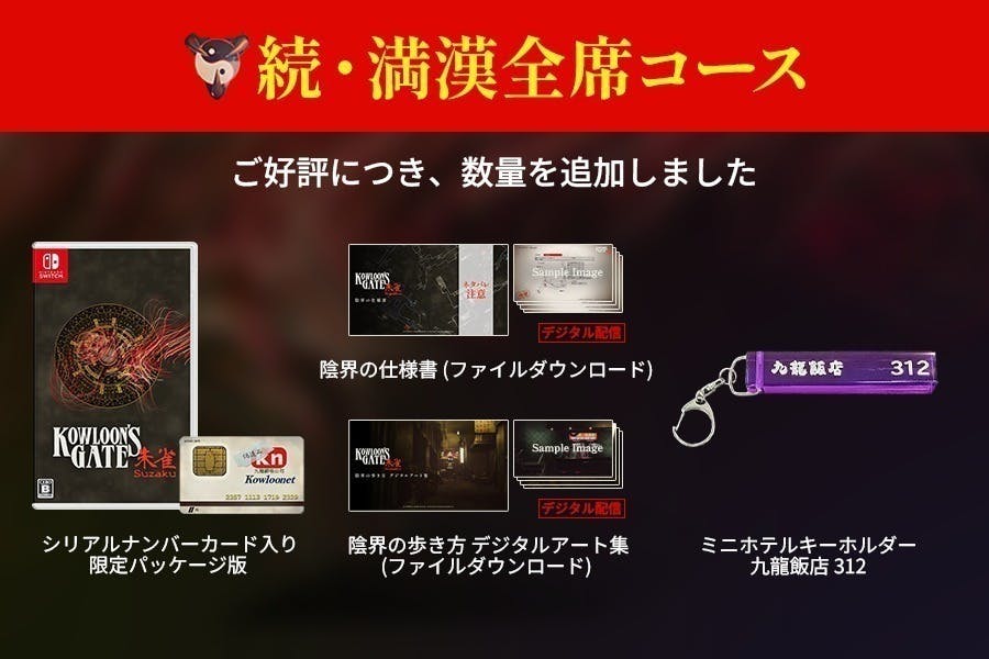 Nintendo Switch版『クーロンズゲート Suzaku』を、限定パッケージ仕様でお届けします。シリアルナンバー入り“Kowloonet”アクセスカードに加え、ゲーム内に登場するアイテムをもとに制作した「九龍飯店312」プロップモデル仕様ミニキーホルダーをセットにしました。