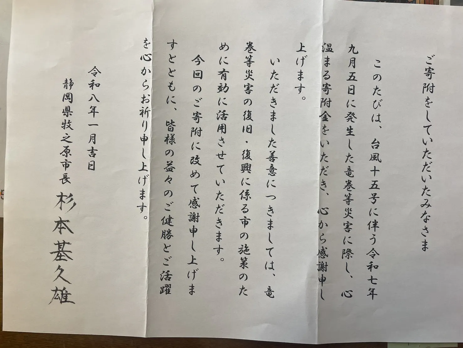 2026/01/29 09:381/26に牧之原市財務課様より、静岡二区が台風15号竜巻被害へ義援金を寄付した際の寄付金受領証明書が届きました。 お寄付を頂いた方々へ、この場をかりて、お礼を申し上げます。 もっと見るクラウドファンディング会計報告
