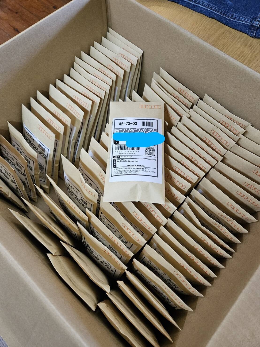 リターン品のエコバッグ、時間がかかりましたがすべて折りたたみ、きのうお礼状、送り状も作成し梱包完了しました。2-3日でポストに投函されます。ご確認のほうよろしくお願いいたします。