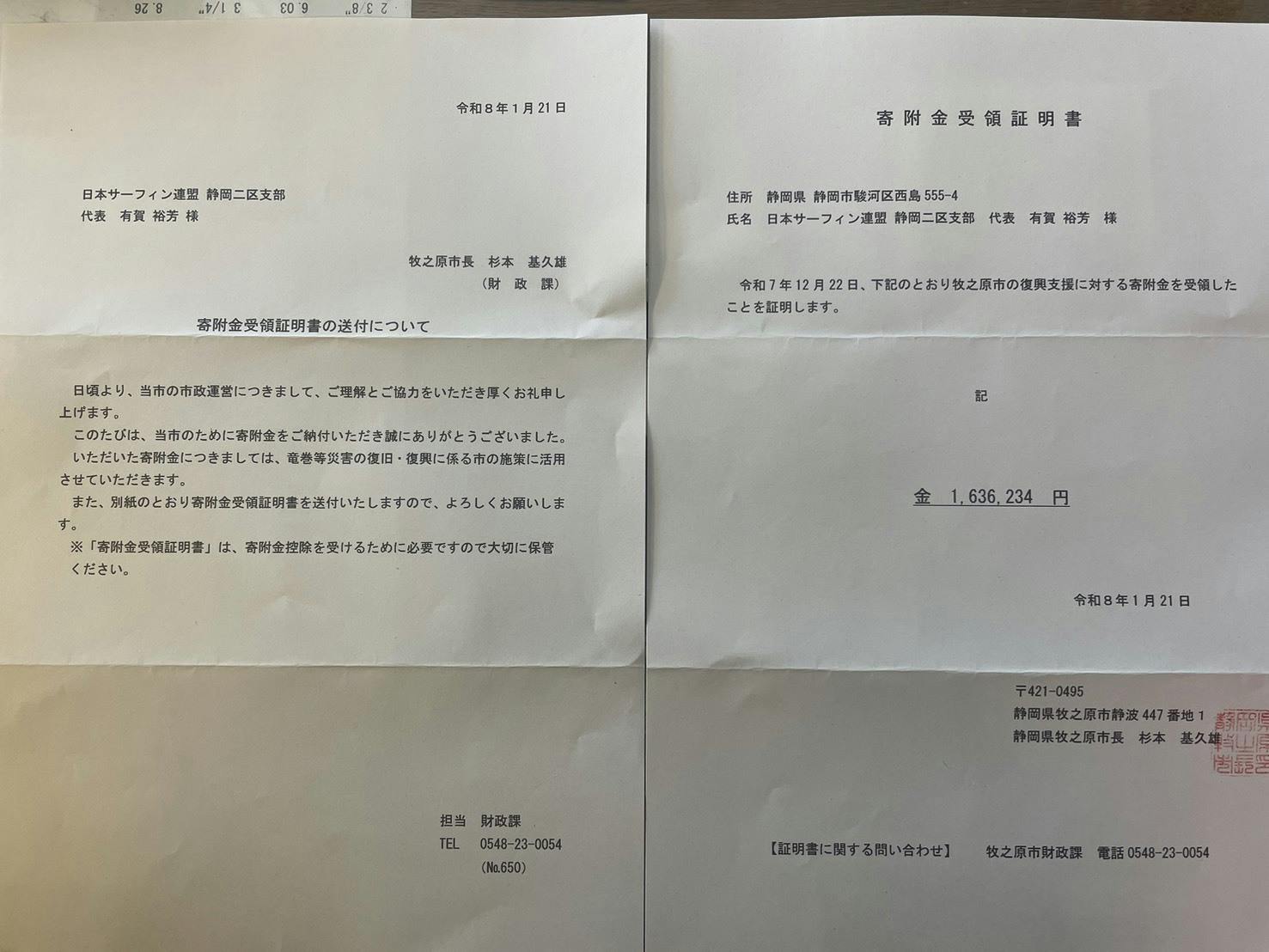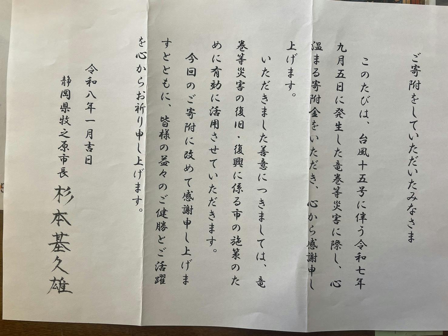 1/26に牧之原市財務課様より、静岡二区が台風15号竜巻被害へ義援金を寄付した際の寄付金受領証明書が届きました。