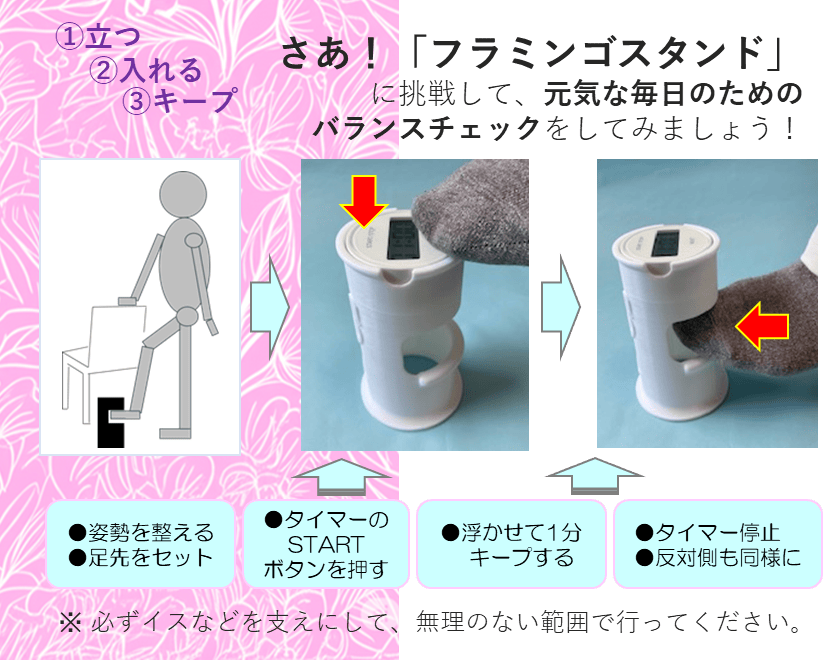 A. ダイナミックフラミンゴ体操は、股関節周りの筋力強化やバランス能力の向上が期待できます。ただし、片足立ちは股関節に体重の4倍の重さがかかると言われています。ご使用の際は、よろしければ念のためかかりつけのお医者様にご相談いただくことをおすすめいたします。