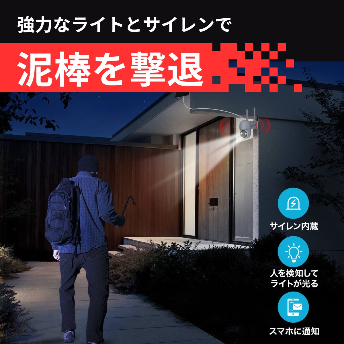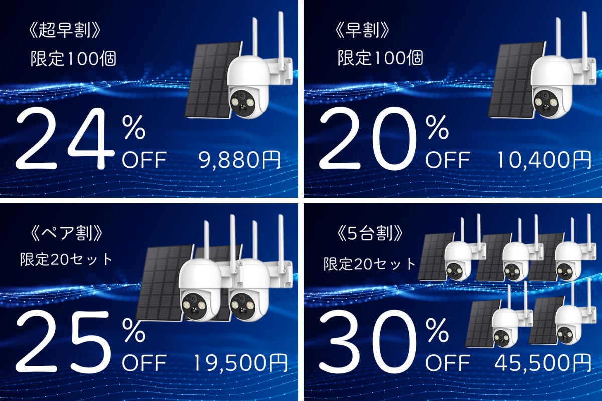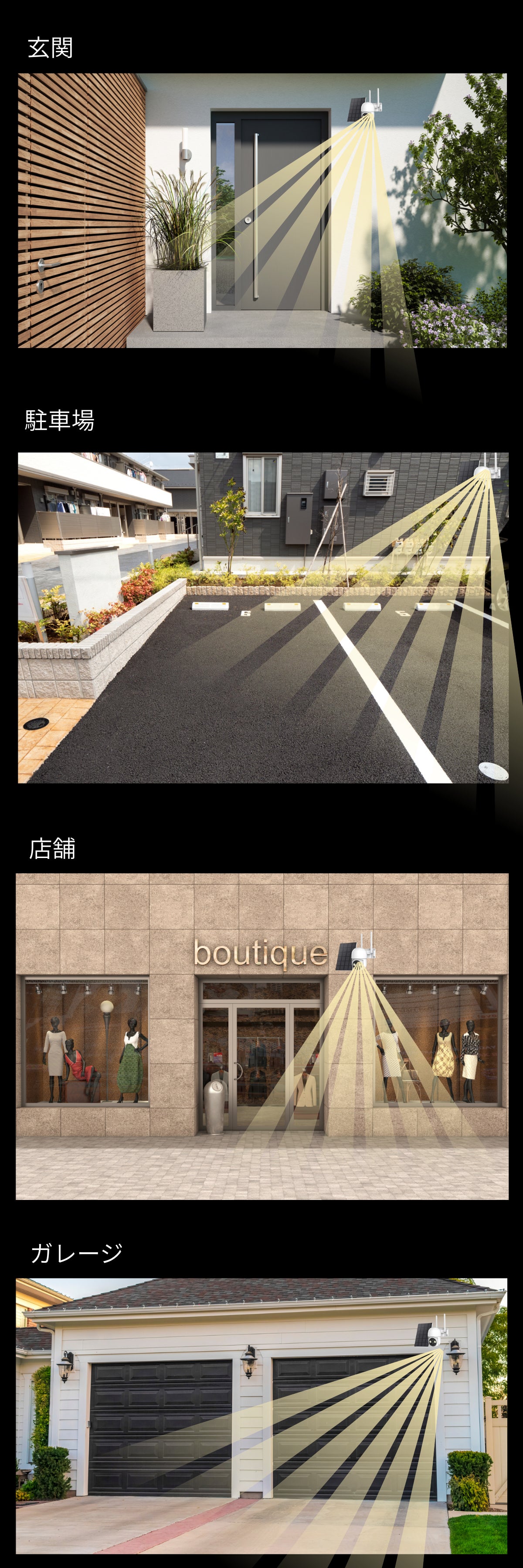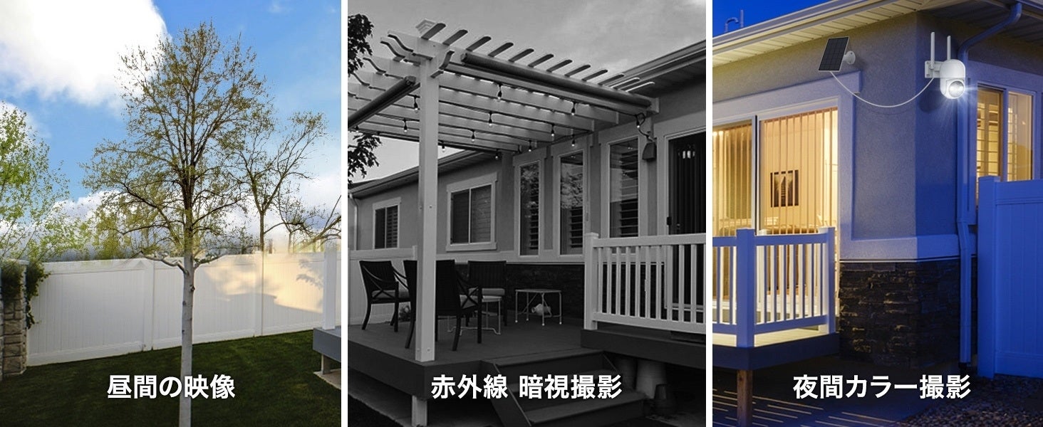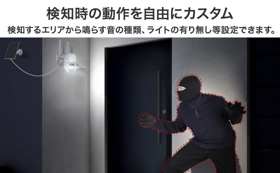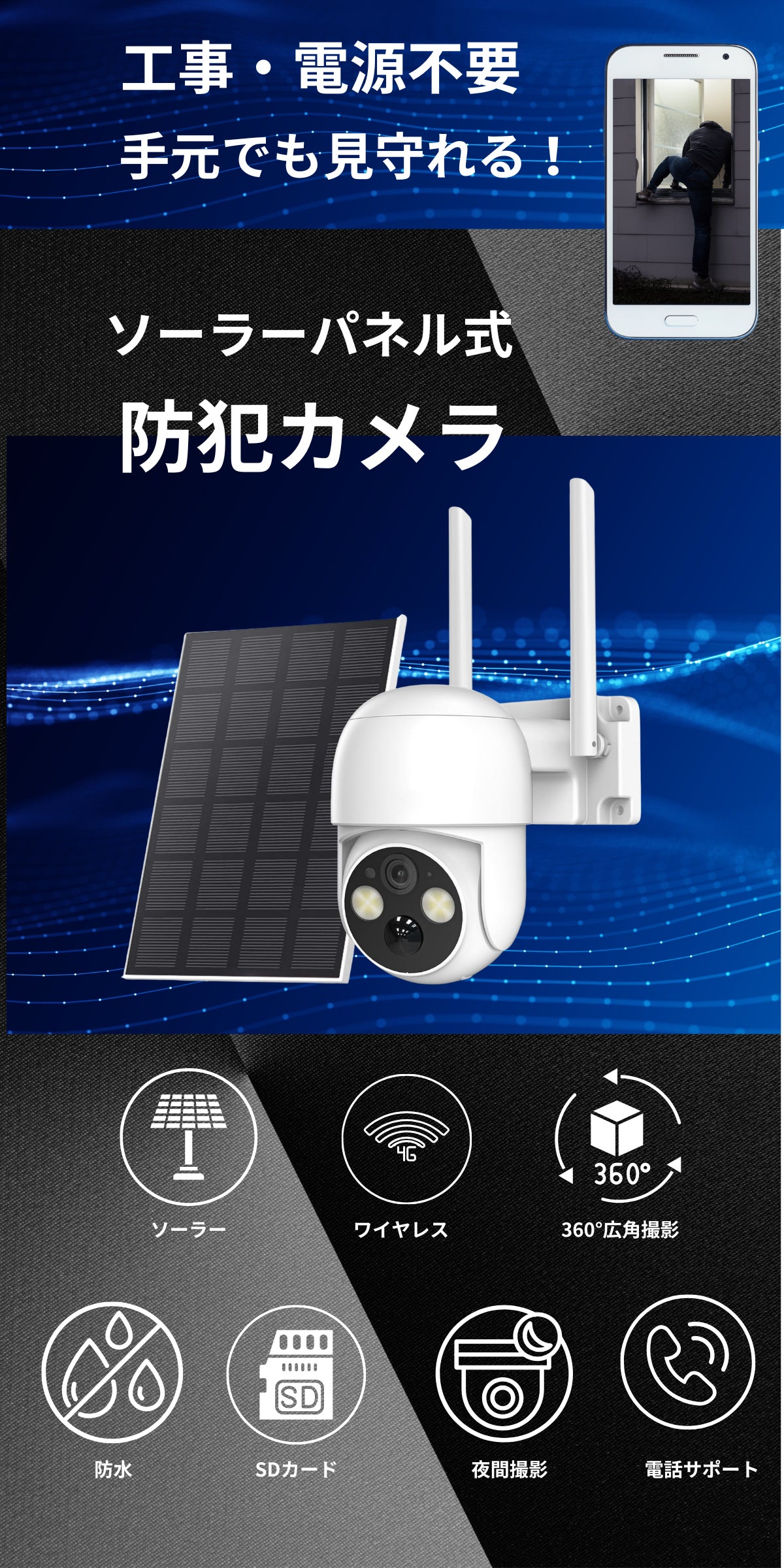 この防犯カメラは、革新的なソーラーパネル技術を活用し、外部電源不要です。太陽光による充電で24時間監視を実現し、昼夜問わず高品質な映像を提供します。環境にやさしく、停電時でも連続稼働が可能。設置場所の制約がないため、屋外や遠隔地でも安心して利用できます。カメラ本体は粉塵が内部に侵入しない・いかなる方向からの水の直接噴流によっても有害な影響を受けない防水規格IP65を取得しているので屋外設置もOK。(注:電源アダプターは防水仕様ではありません)