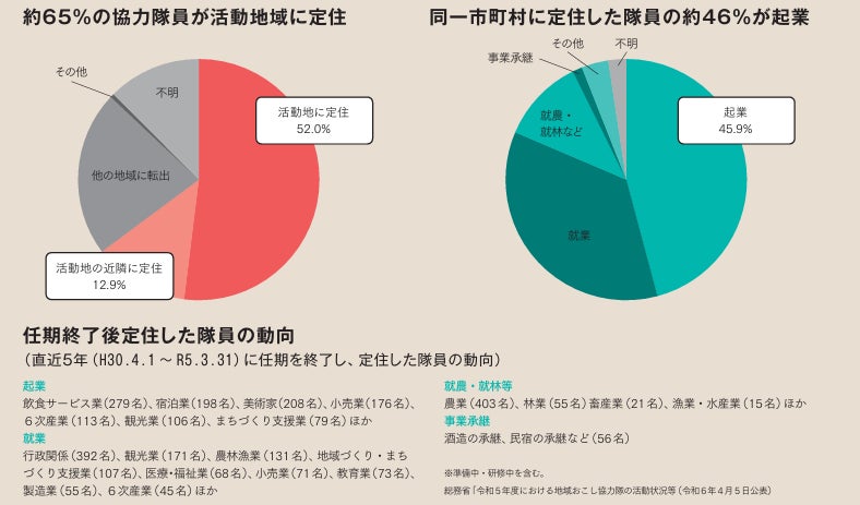 隊員は各自治体からの委嘱を受け、任期はおおむね1年から3年です。任期後は全国で約65%の隊員が活動地域に定住し、定住した隊員のうち約46%が起業しており、地方の人口減少対策と賑わい創出を担う制度となっています。(直近5年間のデータ。総務省HP 地域おこし協力隊ハンドブック参照)