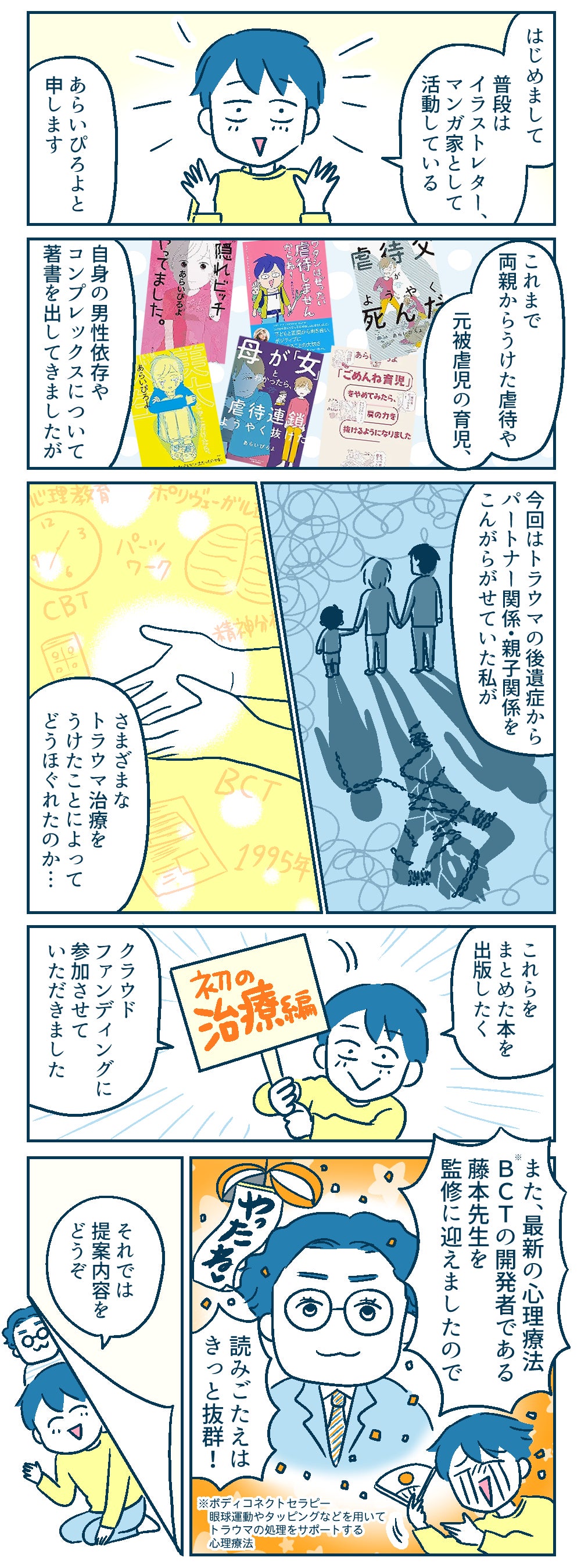 2025/11/15 14:222025/11/14プロジェクト、大成功で終了いたしました!!!(涙)感激しております・・・!なんと、当初の目標額50万円を大きく上回る857,700円、214名様からご支援をいただきました。あたたかな応援メッセージもたくさんいただき、目頭が熱くなるとともに、早く世に出さねばという気持ちでいっぱいです。皆様の思いに報いるべく、これから本気の執筆に入ります。2026年1月中にネーム(漫画の下書き)を書きあげ、監修の先生方のチェックを経たのち3月ごろから清書に入ります。その後、先生方に最終チェック&出版社の校閲チェックを通して6月には皆さまのお手元に届くよう、頑張ります!この本はみんなで作った本です(まだ完成してませんが)。そういう本が社会に出ていくという希望だけで、私はすでにうれしいです。今後は、ご報告できる進捗があり次第、こちらの「活動報告」欄でご報告させていただきます。また、オンライントークイベントつきのリターンを選択した皆様、日程や参加方法などについては、書籍完成のめどが立ってからのご連絡とさせてください。気長にお待ちいただけますと幸いです。寒い日が続きますが、ぬっくり(ゆっくり&ぬくぬく)お過ごしくださいね。あらいぴろよ【備考】・本プロジェクトは出版社と提携して進めており、監修者の藤本昌樹先生には出版社より正規の監修料のみ支払われることになっております。プロジェクトのご支援金とは利害関係がありません。・監修者の藤本先生の専門分野であるBCT(ボディ・コネクト・セラピー)だけでなく、他の治療法にも公平に言及します。また、効果には個人差があることをご了承ください。・ご支援金857,700円は、制作に必要な実費(出版費用の不足分):276,640円/精神科医の先生への監修謝礼:約300,000円/完成書籍を送付する際の費用(1冊300円×202名様換算):60,600円/CAMPFIRE手数料:160,389円/残り60,071 円は私の原稿料として使用させていただきます。 もっと見る