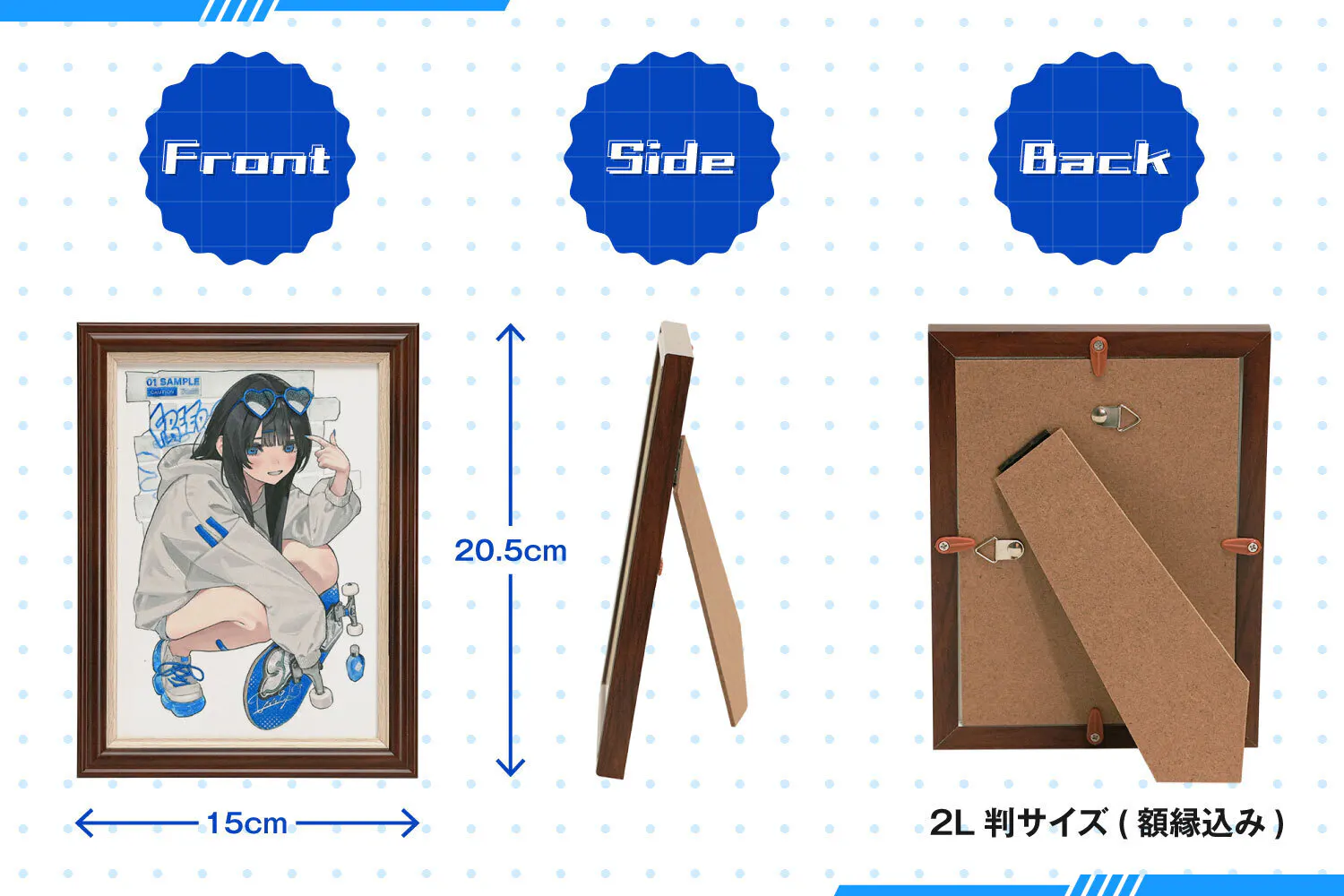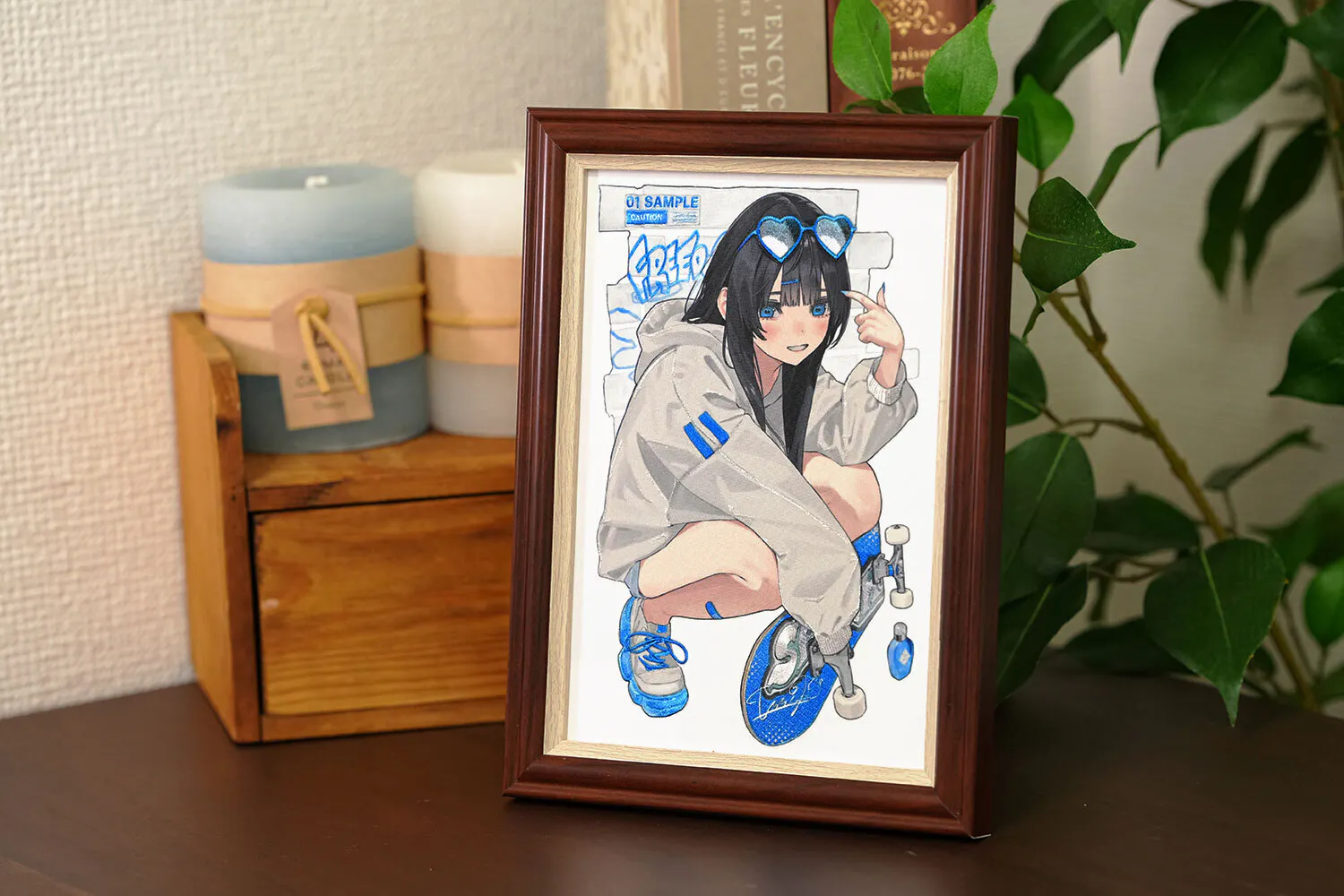 イラストを引き立たせる温かみのあるブラウンの額装に入れてお届けします。