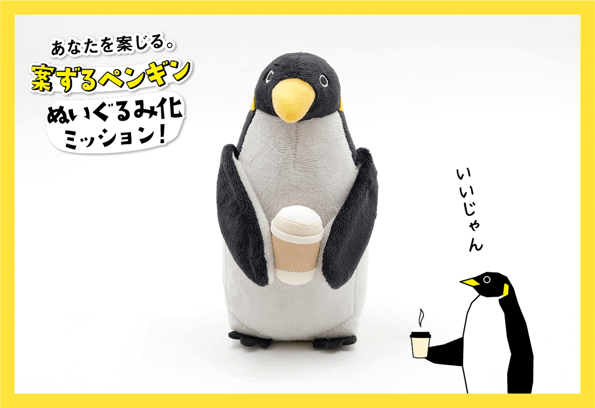 なにかと人間を案じている「案ずるペンギン」が、ついに、ぬいぐるみ化に挑戦します!