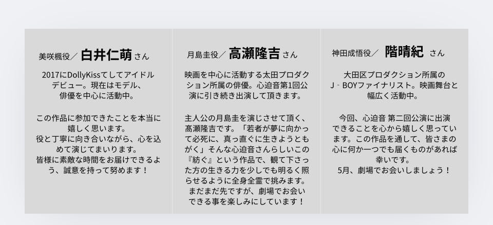 私たちが心迫音が演劇公演を立ち上げた背景にはお芝居を好きな人全てが潤い、循環して行きたいと思いがありました。今の小劇場界はとても資金面などが厳しく、夢や楽しさと引き換えに苦しい思いをする人が多く居ます。