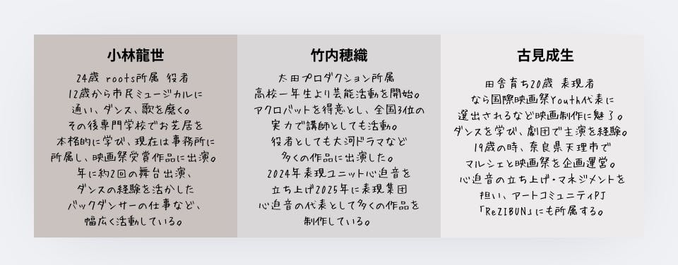 心迫音とは若手俳優、クリエイターが集まり映像、舞台など幅広い芸術創作をしていく表現集団です。『何者にでもなれる何者でもない』を掲げ、完全オリジナルの台本と世界観で多くの作品を制作してきました。