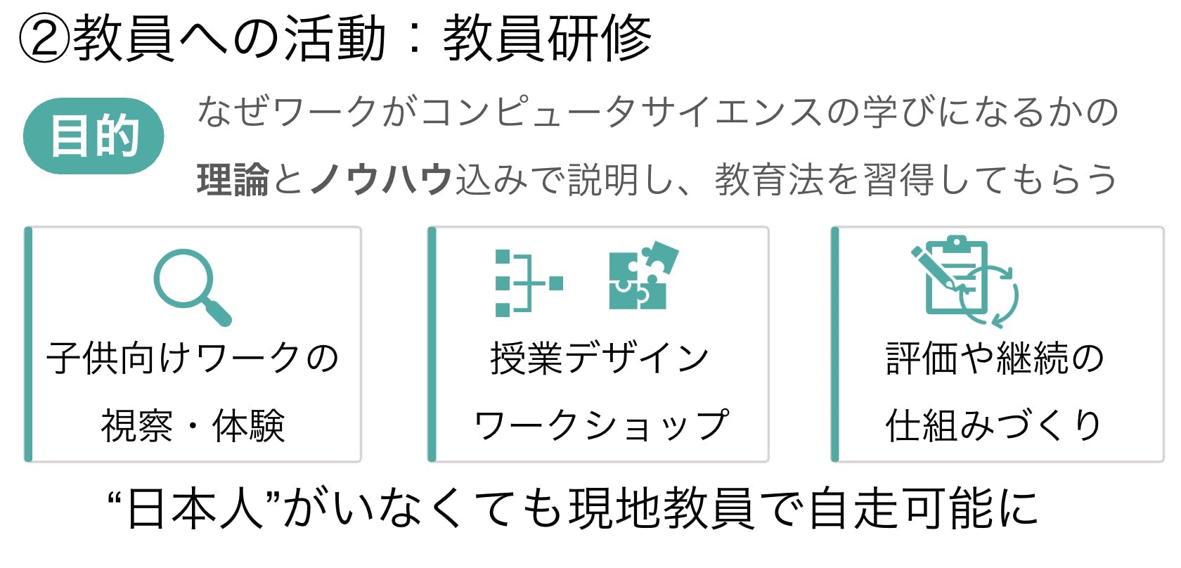 私たちは、アンプラグドICT教育の持続的な導入のために、生徒・教員の両方にアプローチをします。