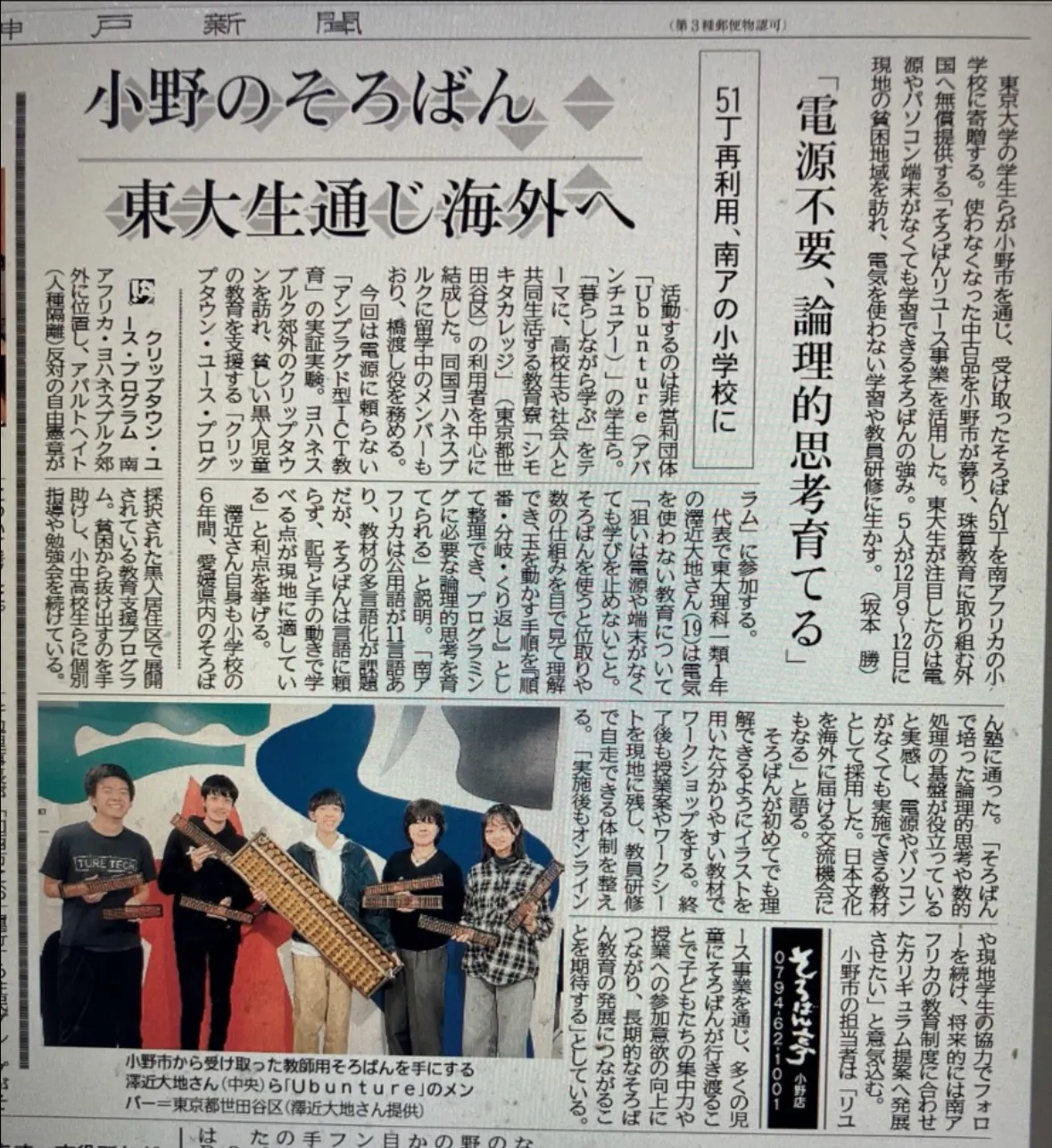 2025/11/29 15:52いつも本プロジェクトを応援してくださっている皆さま、誠にありがとうございます。このたび、私たちUbuntureの取り組みを、神戸新聞に取り上げていただきました。「そろばんのまち」として知られる兵庫県小野市とのご縁や、私たちの挑戦の内容も丁寧に取り上げていただきました。Ubuntureの主な活動拠点であるSHIMOKITA COLLEGEにも記事を掲示し、多くの方に見ていただく中で、「日本と南アフリカをそろばんでつなぐ」プロジェクトへの関心や応援の声をいただいています。渡航まであと少しですが、現地活動費の調達や現地での移動など、様々な場面でまだ多くの方のお力をお借りする必要があります。引き続き、広報や準備を全力で進めてまいりますので、もしプロジェクトの趣旨に共感していただけましたら、ページを周りの方にシェアしていただいたり、ご無理のない範囲でご支援いただけますと大変心強いです。新聞というかたちで、これまで支えてくださった皆さまとのご縁が「見えるかたち」になったことに、改めて感謝の気持ちでいっぱいです。引き続き、「学びのバトン」を南アフリカの子どもたちへつないでいくために、チーム一同精一杯活動してまいります。今後ともあたたかく見守っていただけますと嬉しいです。どうぞよろしくお願いいたします。 もっと見る