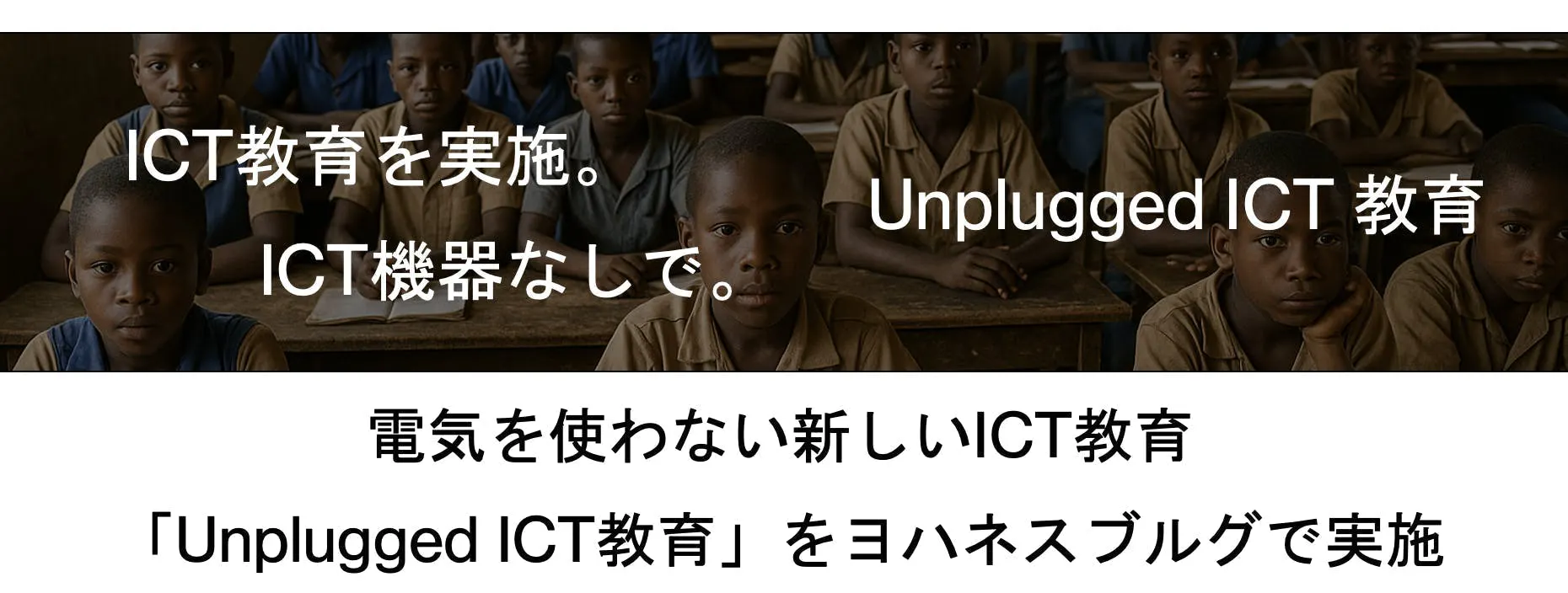 A. ヨハネスブルグの学校で、電気・PC・インターネットに頼らない「アンプラグドICT教育」の授業と、先生向けの研修(ToT)を実施します。初回は2025年12月9日〜13日の4日間、児童約120名/教員約40名を対象に行い、並行して授業視察やヒアリング等の調査も実施します。