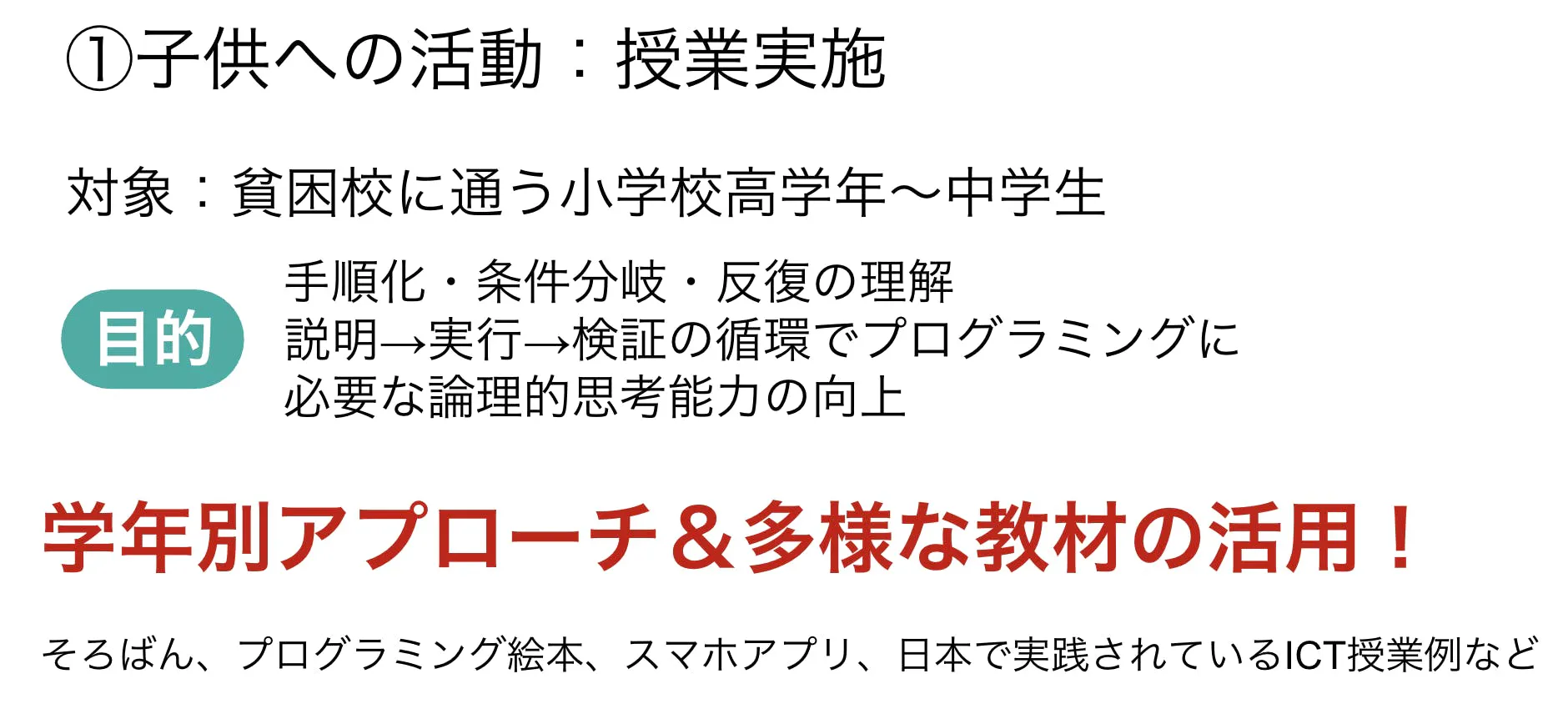 授業設計には工夫を凝らしており、日本由来の計算機であるそろばんの活用、コンピュータサイエンスに関する知識を分かりやすく教える絵本の使用、スマホを使ったアプリでのICT教育、日本で成功したアンプラグドICT授業例の応用などを行います。