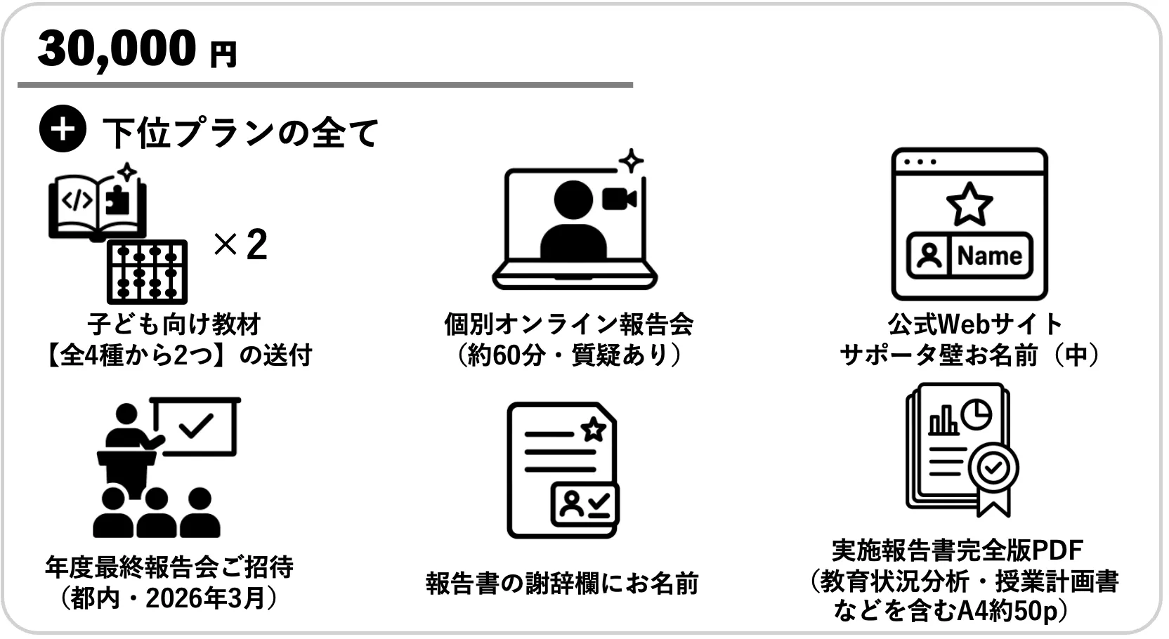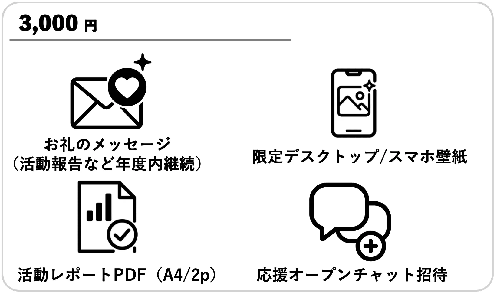A. 概要はページ記載のとおりです。デジタル系(お礼メール・壁紙・PDFレポート・限定活動日記・非公開アルバム)は現地実施前後〜2月にかけて順次、物的リターン(ポストカード・教材紙版など)は2026年3月までにお届け予定、年度最終報告会は2026年3月(都内・オンライン併用)を予定しています。