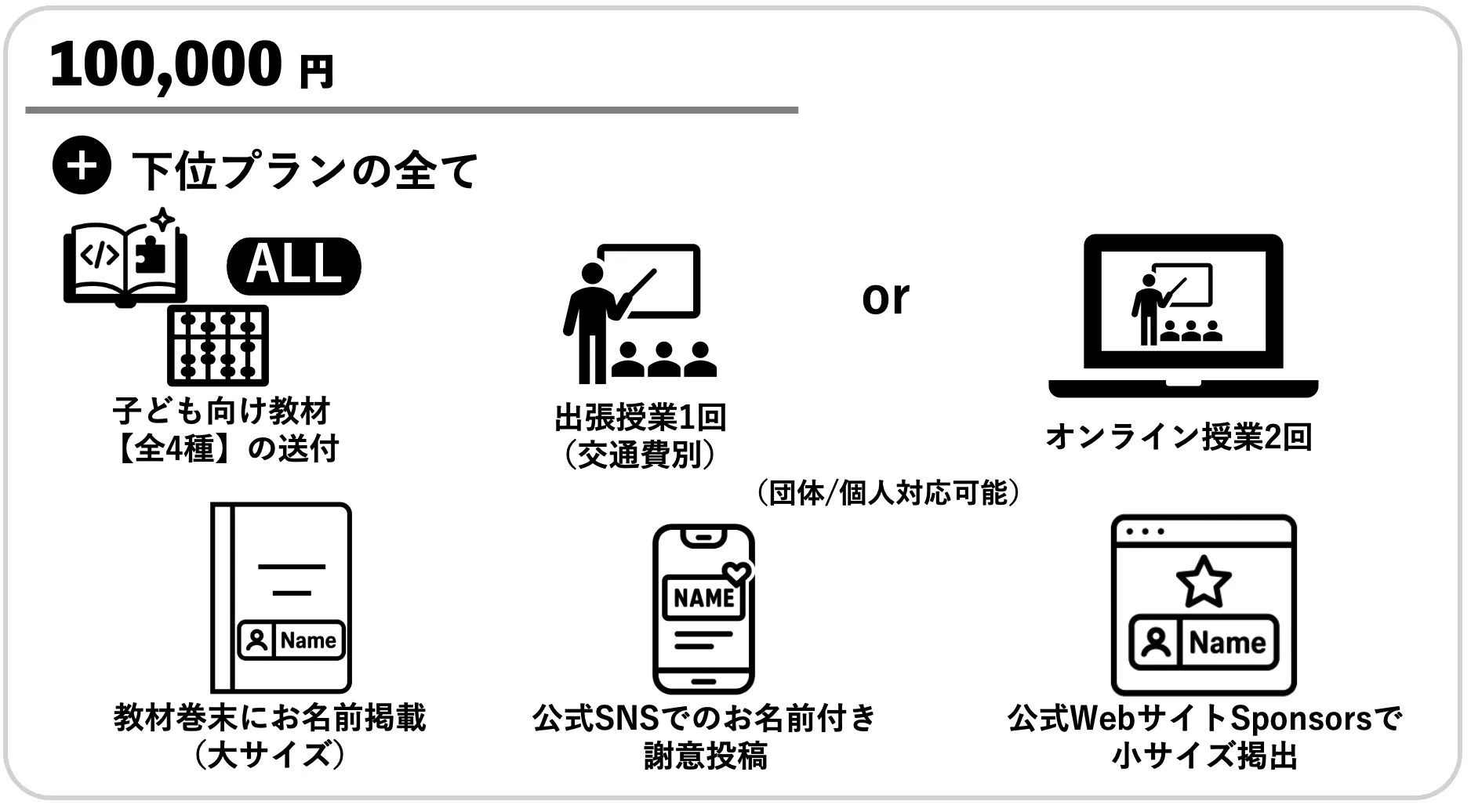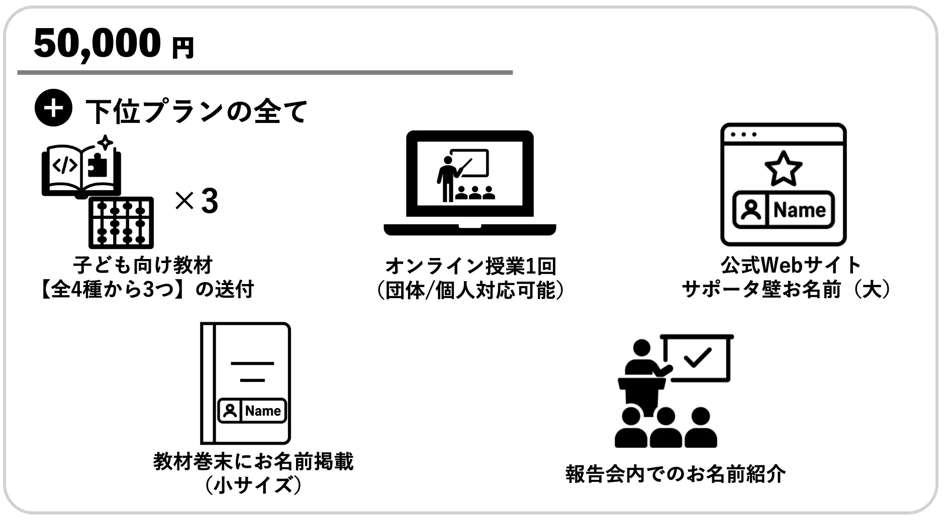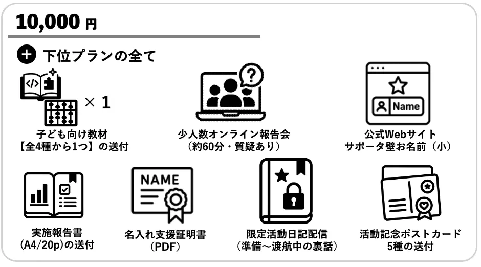 リターンは以下の通りです。詳細はリターンページをご覧ください。(各プランには下位プランのリターンが含まれますが、下位プランと上位プランで同内容のリターンは上位プランのみを含みます。)