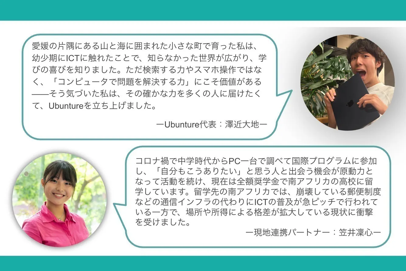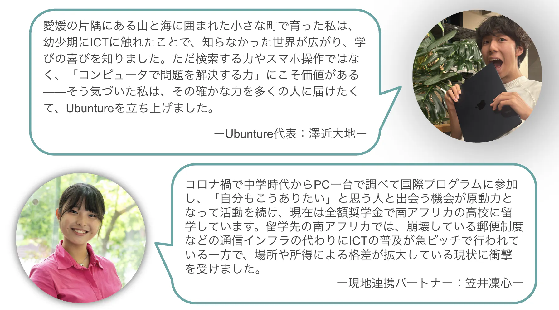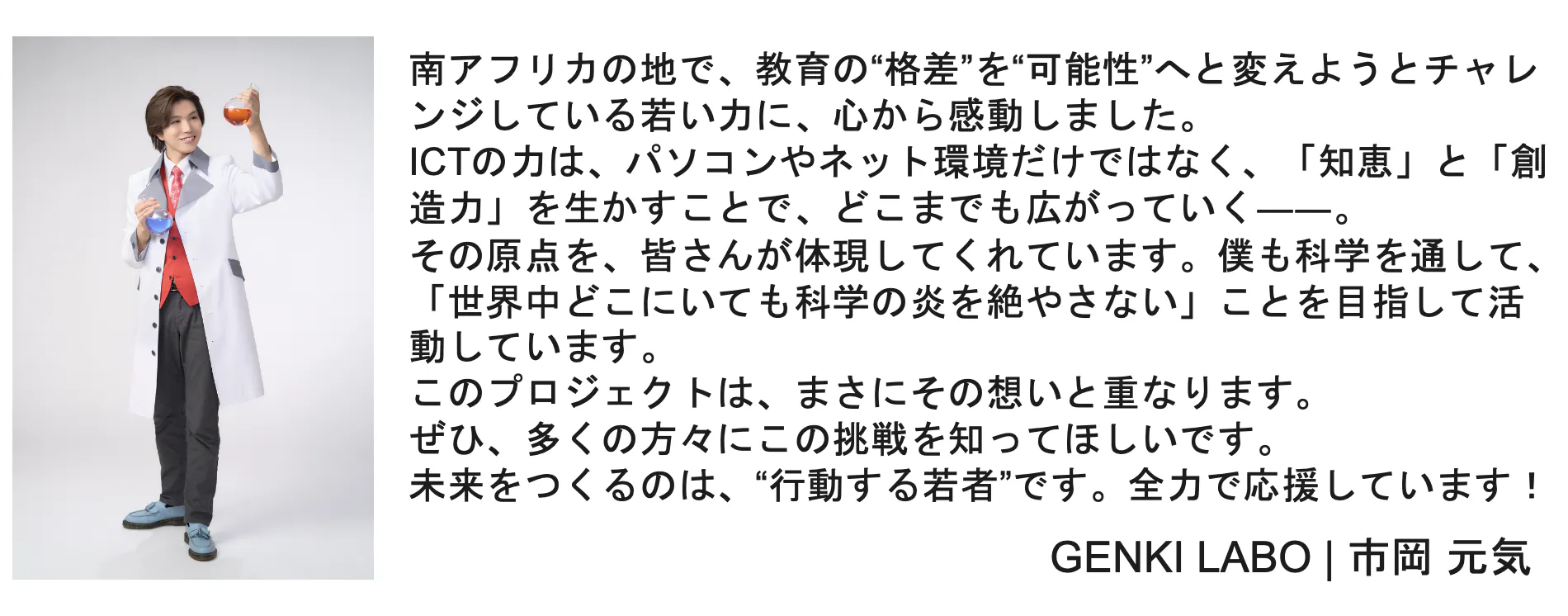 凜心さんからのメッセージを読んだとき、僕は、遠い南アフリカで自分と同じ経験をした仲間がいることに、強く心を揺さぶられました。ICTが世界を広げてくれたこと。学びが誰かを笑顔にできると知ったこと。そして、その機会がすべての子どもにあるわけではないという現実。