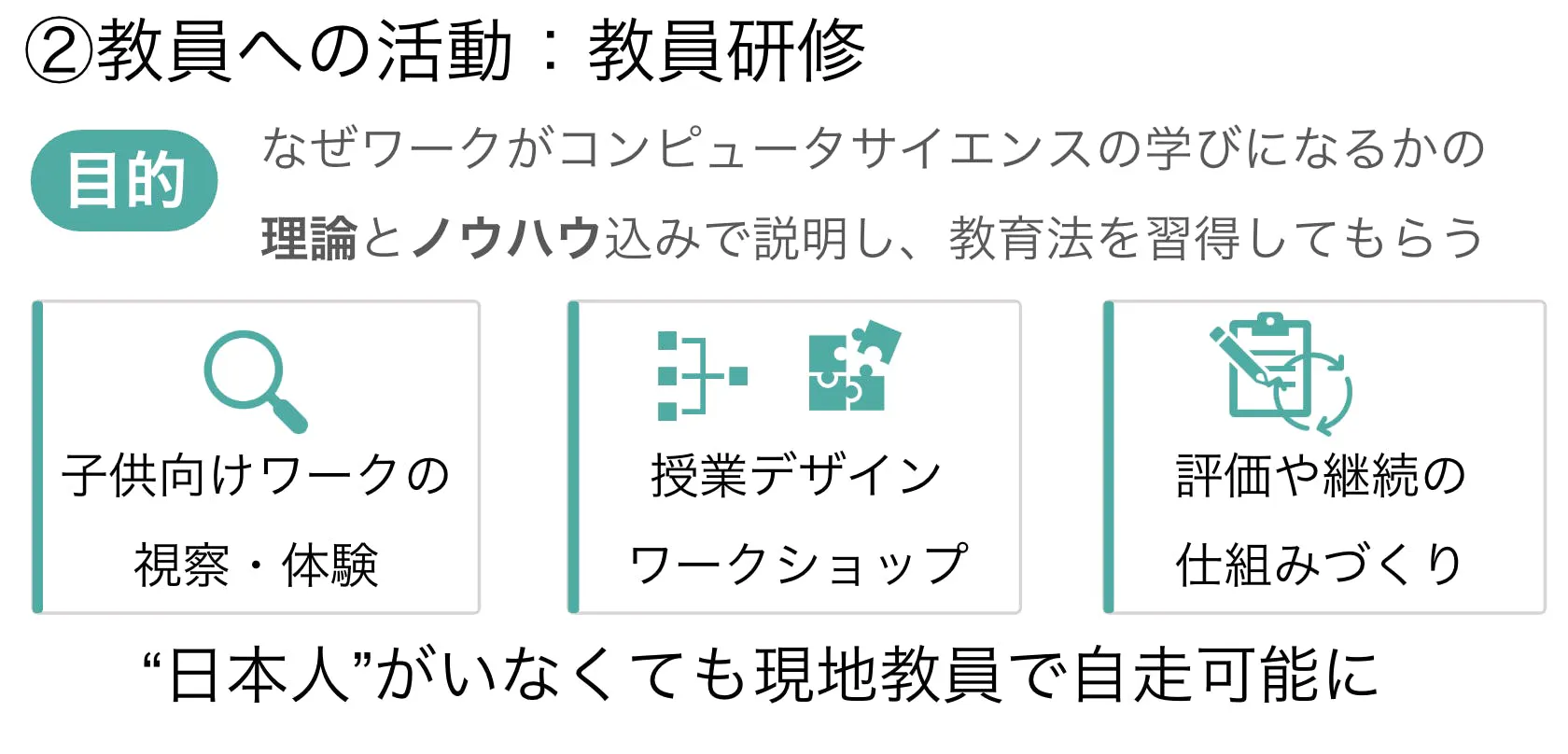 私たちは、アンプラグドICT教育の持続的な導入のために、生徒・教員の両方にアプローチをします。