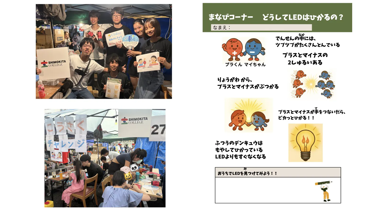 2025年8月9日・10日の二日間、下北沢駅前広場で開催された「下北沢盆踊り」にて、UbuntureはSHIMOKITA Collegeとコラボし、居住者の大学生・高校生と外部の東京大学の学生の協力のもと、子ども向け工作教室をオープンしました。LED提灯づくり(紙+LEDキット)とヤジロベエづくり(粘土+竹串)が作れるブースで、2日で100名以上の子どもたちが参加しました。
