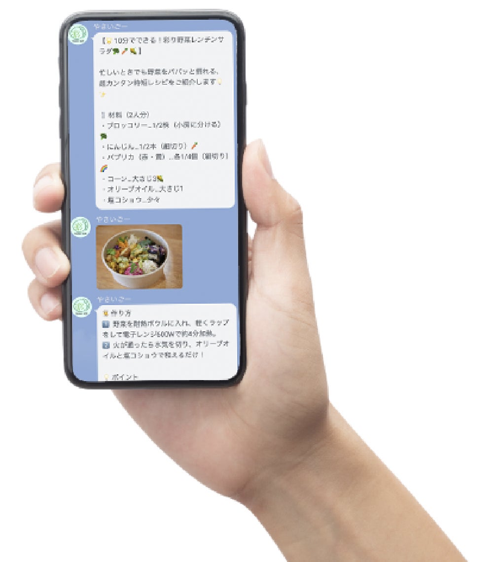 LINE版「やさいごー通信」のイメージこうした取り組みを通じて、「やさい号」は子ども食堂での一時的な支援にとどまらず、家庭での食習慣を前向きに変えていく長期的なサポートを目指します。