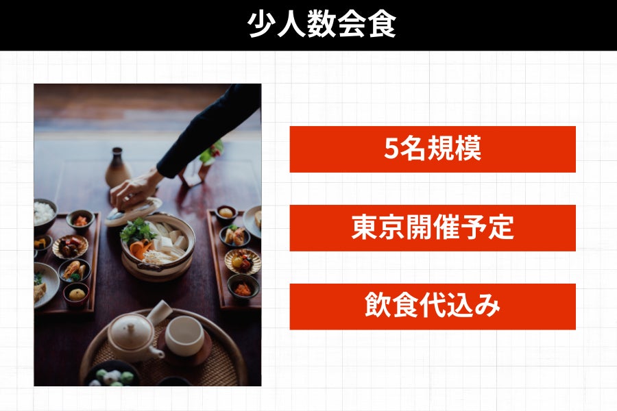 交流会食パーティ(10-15名)・少人数会食(4-6名)・サシ飲み(1対1深堀りセッション)の3種類をご用意。