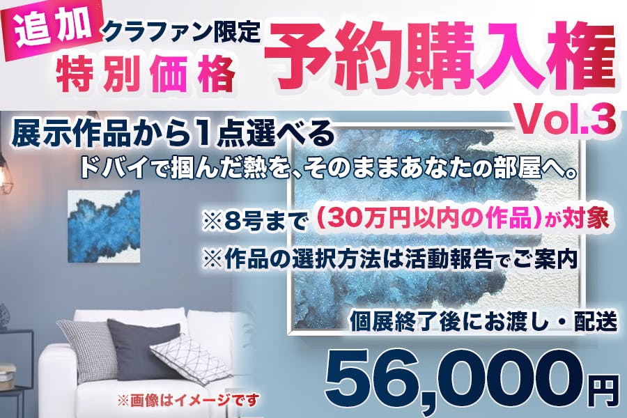 新作を含めた展示作品(販売対象作品)、8号サイズまでの中から、お好きな展示作品を1点だけ予約購入し、お選びいただける権利です。好評だったので、現在第3弾です。(サイズに関しては下記参照)