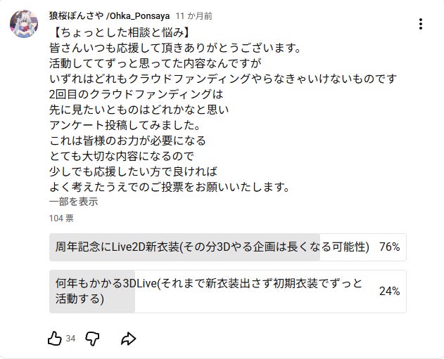 2026/03/05 17:30こんニンニン!どうもぽんさやです!いよいよ一ヶ月が過ぎましたね!早かったな~あっという間だったな~って思いました。でも私の中ではまだ諦めきれなくてまだ成功させたい気持ちがあります。皆さんからも「新衣装見たい」と沢山のコメントもいただいております。本当に嬉しいですありがとうございます。私自身皆さんの夢を叶えてあげたいのですが私の力不足で今までの結果を出せない状態が続いていて本当に申し訳ないと思っています。どうかお願いします。皆さんのお力がどうしても必要です。もっとこうして欲しいとかありましたら出来るだけ対応したいのでメッセージで教えて頂けると幸いです。皆さんが喜んで頂けるか分かりませんが...少しだけプランを追加してみました。3点のみ限定セットとなっております!▷特別耳舐め30分間耐久(ぽんちゃん・ぽんくん)約30分間ぽんちゃん・ぽんくんセットでひたすらASMR耳舐めボイスをお届けします!※成人向けではございません▷名前付きリクエストシチュエーションボイス約20分名前付きのリクエストシチュエーションボイスをお届けします!どんなシチュエーションにしたいか自由にご相談することが出来ます▷名前付きASMRシチュエーションボイス約30分名前付きのASMRリクエストシチュエーションボイスをお届けします!耳舐めもよし!どんなシチュエーションボイスにしたいか自由にご相談することが出来ます▷1on1通話券約2時間二人っきり!新衣装のお姿で一緒にお話しします!有効期限:2026年9月1日から2026年12月31日まで▷エコバックちょっとしたお買い物にも!お弁当サイズにも入るエコバックです!▷グラスカップ 新衣装のキービジュアルのクラスカップです!▷手作りトレカカードケース(ぽんちゃんトレカカード付き)ホイップでデコるトレカカードケースです!愛情込めてお作りします!どんなデザインにしたいか好きな色もリクエスト出来ます!追加しました!▷歌リクエスト歌のリクエスト受け付けます!(フリー音源)▷通話後の短いボイス(感想)1on1通話終了後に感想メッセージを送ります!▼以下を含みます▷Xヘッダー (デジタル)▷ネットプリントキービジュアル(デジタル)▷お礼ショートボイス(約1分)▷スマホ待ち受け(デジタル)▷新デザインネットプリント(デジタル)▷【クラファン限定】新衣装Live2D付き応援お礼動画(約2分)▷ラブレター(デジタル)▷壁紙画像(デジタル)▷チェキデジタル(ぽんちゃん・ぽんくん)▷アクリルスタンド(ぽんちゃん)▷ミニキャラアクリルスタンド(ぽんちゃん・ぽんくんセット)▷缶バッジ▷新デザインネットプリント(直筆サイン入り)▷ぽんさやレジンキーホルダー手作り(オーダー制)▷【ASMR】お泊まりデートシチュエーションボイス(ぽんちゃん・ぽんくん)▷直筆お手紙▷アクリルカード▷ミニ色紙▷写真集▷【クラファン限定】Live2D付きシチュエーションボイス▷アラームボイス▷あなただけのチャットと配信(約1時間)▷色紙▷アクリルコースター▷タペストリーまだ私は諦めておりません。どうか少しでもこの気持ち届いてくれたら嬉しいです長文失礼しました。最後まで読んでいただきありがとうございました。お問い合わせはお気軽にメッセージに送って頂けますと幸いです。どんな質問でもなんでもいいです対応します。皆さんの答えを_Answer_をお聞かせください。狼桜ぽんさや もっと見る説明会をやりました~!