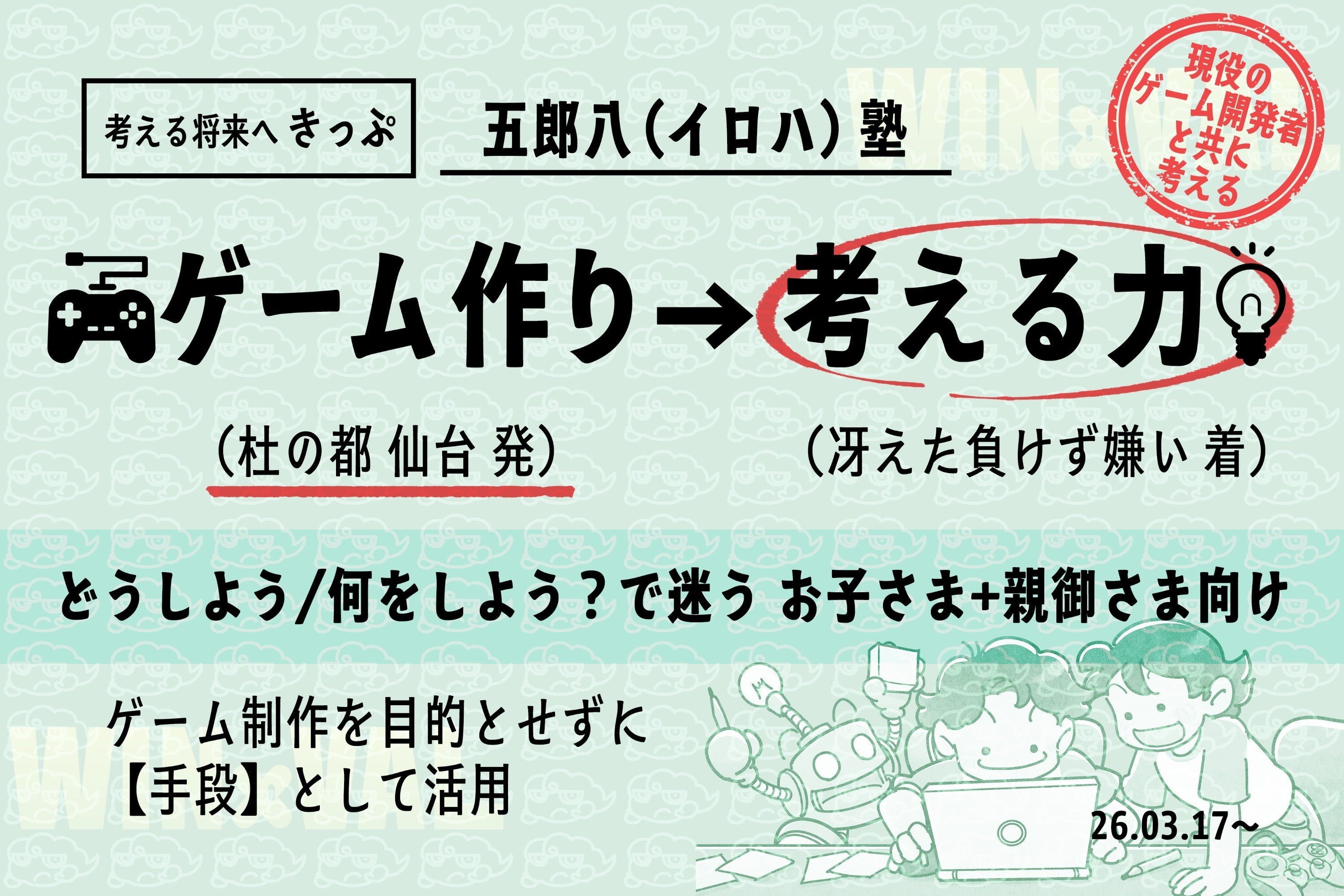 ゲーム制作を通して「一緒に考える」塾を、仙台から始めたいと考えた理由はいくつかあります。ひとつは、発起人が仙台市出身であり、中学校・高校時代を仙台で過ごした、なじみのある土地であるということです。もうひとつは、仙台には大きなゲーム制作会社がまだなく、ゲーム制作がどのような仕事なのか、どのように商品が生まれているのかに知る機会が多くないのではないかと感じている点です。ゲームは身近な存在でありながら、その裏側を知る機会が限られているからこそ、まずは興味から持ってくれるのではないかと考えました。