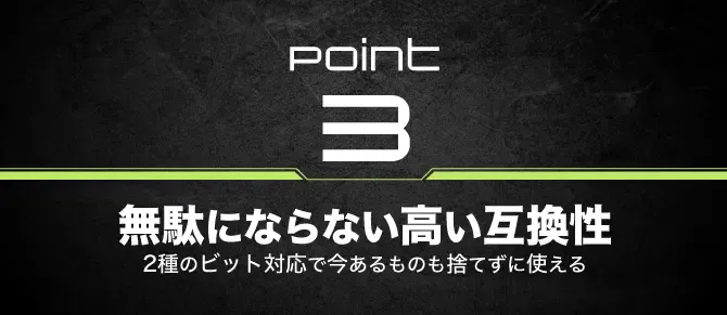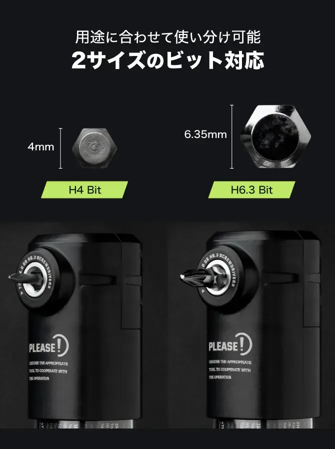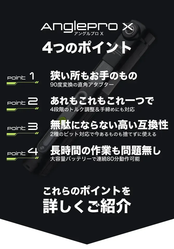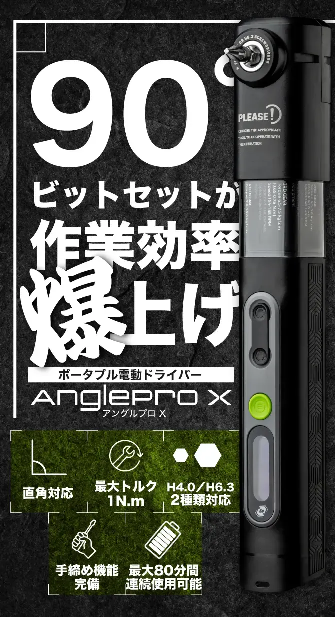 A. Anglepro Xに付属のH6.3ビットおよびH4.0ビットは、一般的な六角軸対応の手動/電動ドライバーでご使用いただけます。市販の工具との互換性も高く、用途に応じてお使いいただけます。