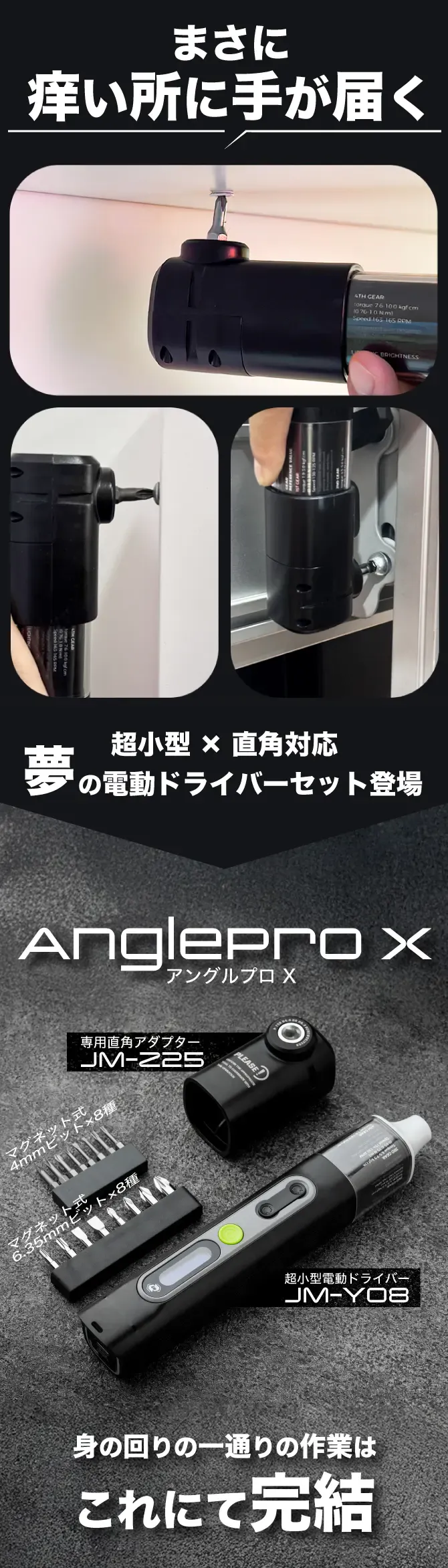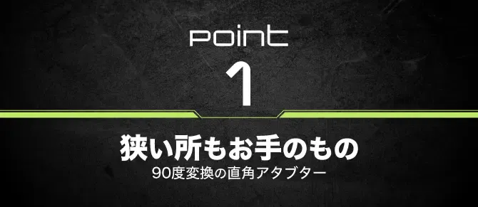 セットのアダプター「JM-Z25」は、ドライバーの回転力を90度に変換し、通常では手が届かないような場所でもネジ回しを可能にします。
