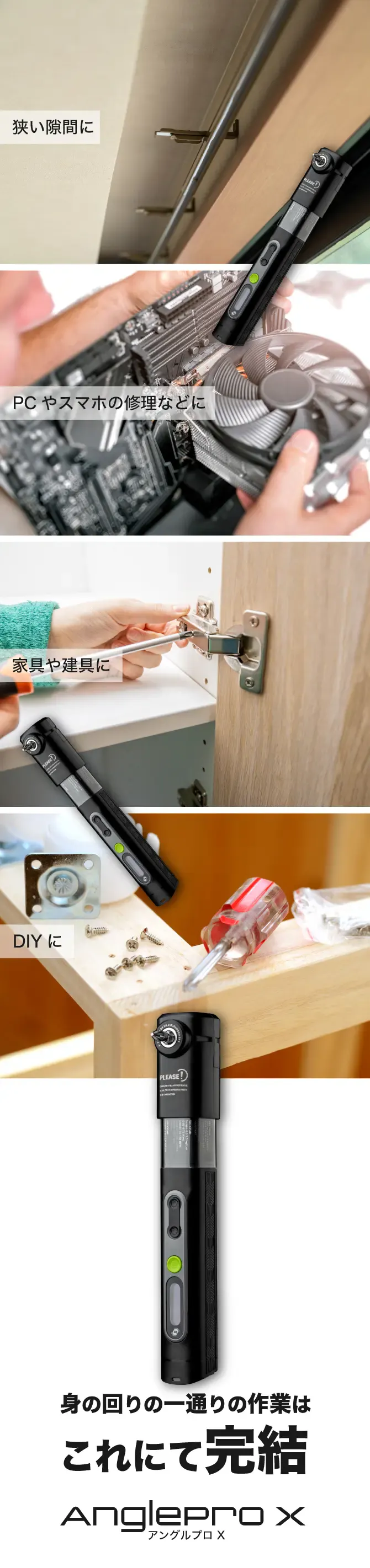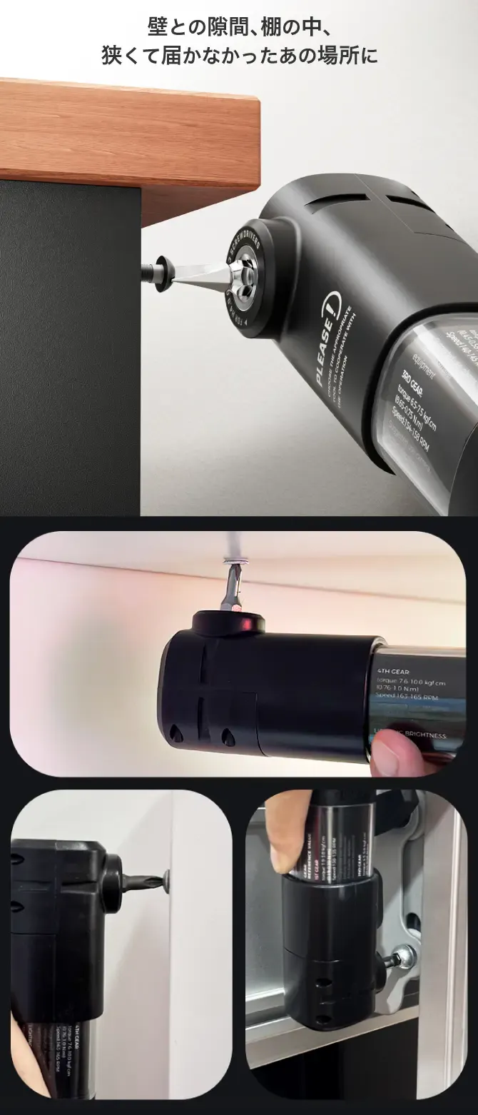 棚のすき間やPC内部、家具の裏側など、既存のL字工具では入らなかった箇所にも対応。コンパクトな設計で、取り回しもスムーズです。