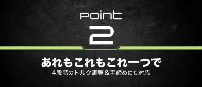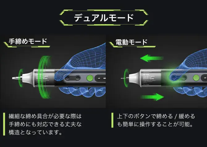 手締め(手動)と電動の切り替えが可能なデュアルモード搭載で、力加減が必要な場面でも頼りになります。(直角アダプターの有無に関係なく使用できます。)
