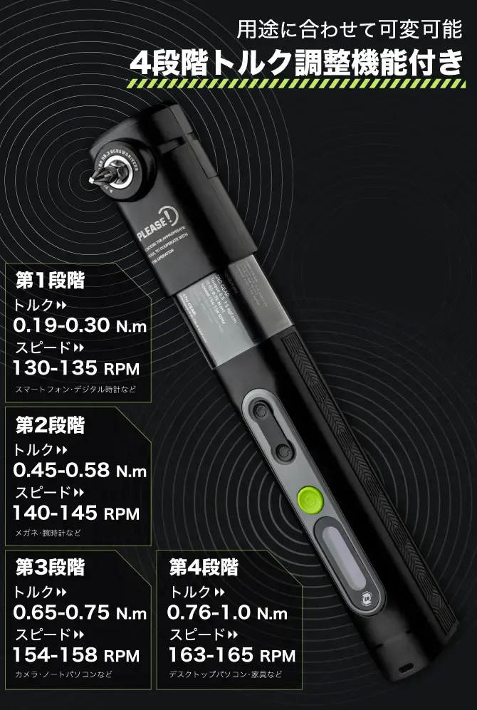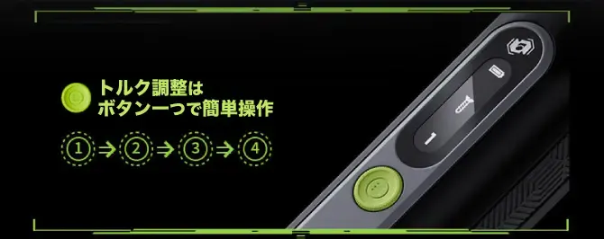 4段階のトルク調整はボタン一つで簡単に行え、130〜165RPMの回転スピードを備えた本格派となっています。