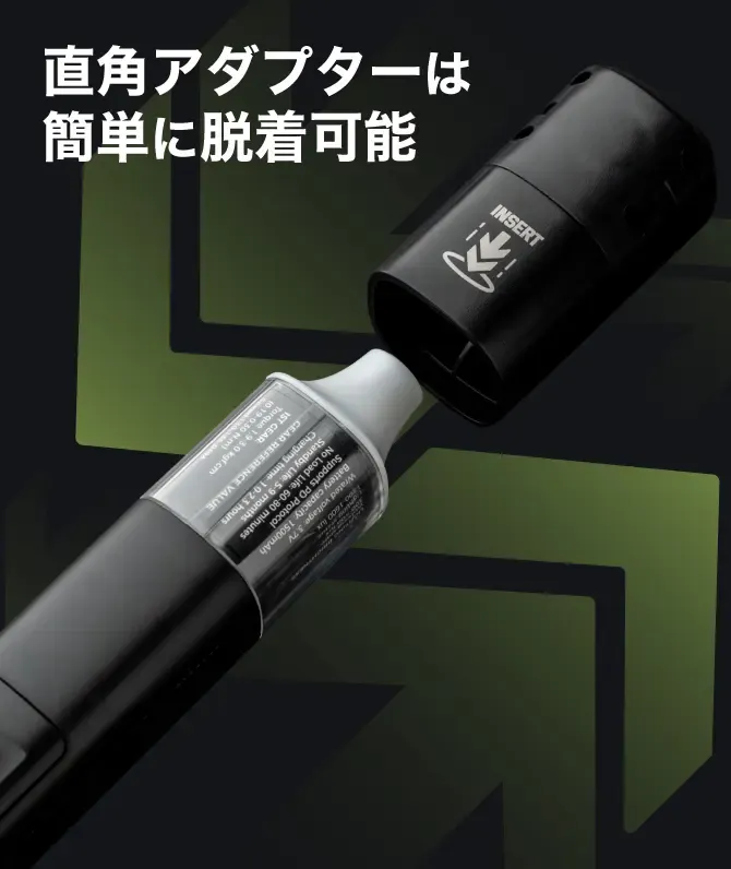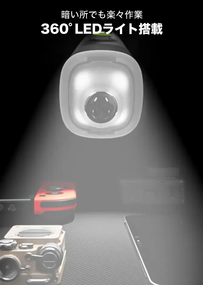 本体には暗い所でも明るく作業ができるように、360°LEDライトが搭載されています。(直角アダプターを装着するとライトは見えなくなります。)