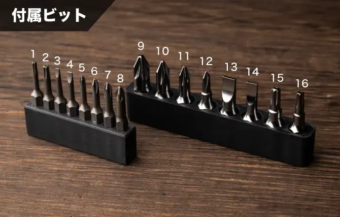 日常用途から精密修理まで幅広く対応できる16本のドライバービットが付属しています。ビットは2つの規格(H4.0mm/H6.3mm)に分かれており、すべてマグネット対応、収納ケースにきれいに収まる仕様です。