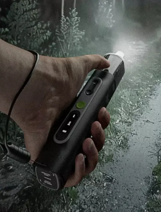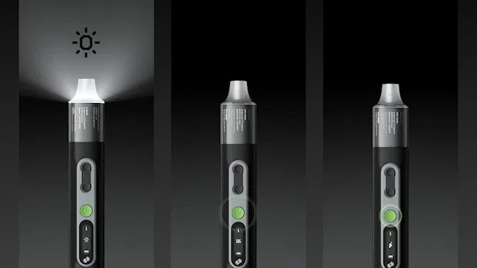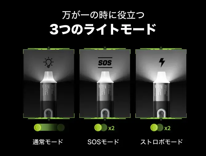 本体の緑のボタンを長押しするとライトが通常モードで点灯します。通常モード点灯中に緑のボタンを短く2回押すとSOSモードとストロボモードへの切り替えが可能になります。