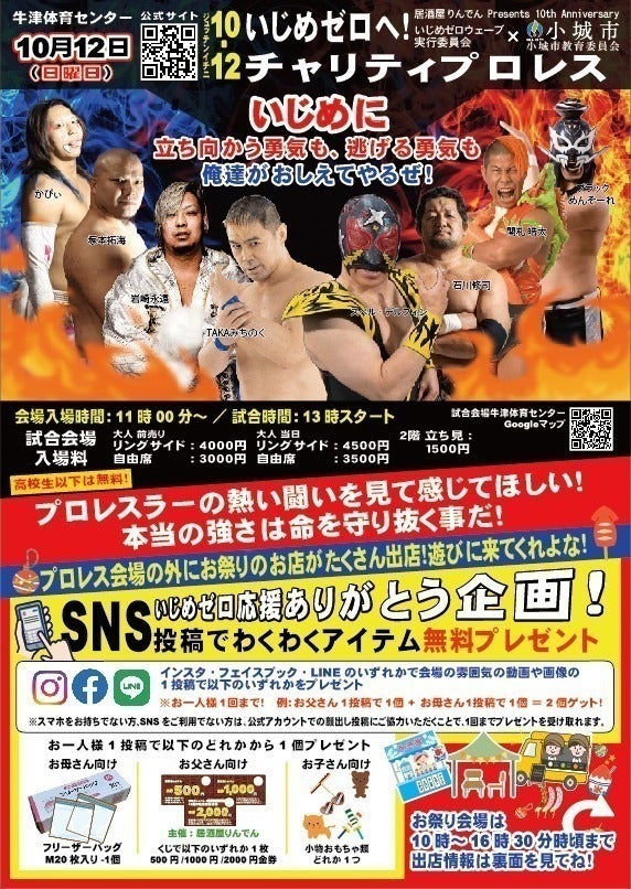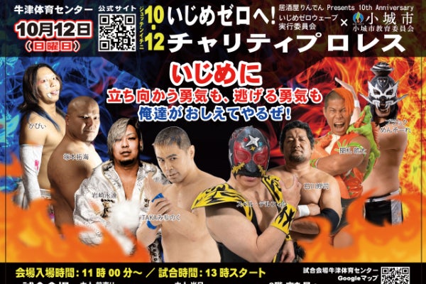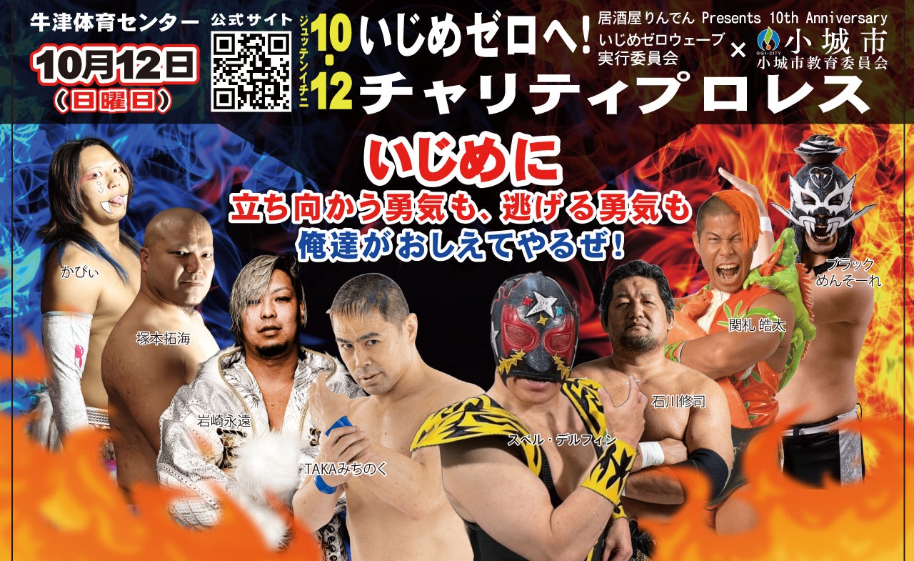 私たちは 「いじめゼロ」 を合言葉に、プロレスラーたちがリング上で「立ち向かう勇気」「逃げる勇気」を全力で伝えるチャリティイベントを開催します。10月12日(日)、小城市・牛津体育センターにて「いじめゼロへ!チャリティプロレス」を実施し、子どもたちや地域の皆さんに「本当の強さとは何か」を届けます。