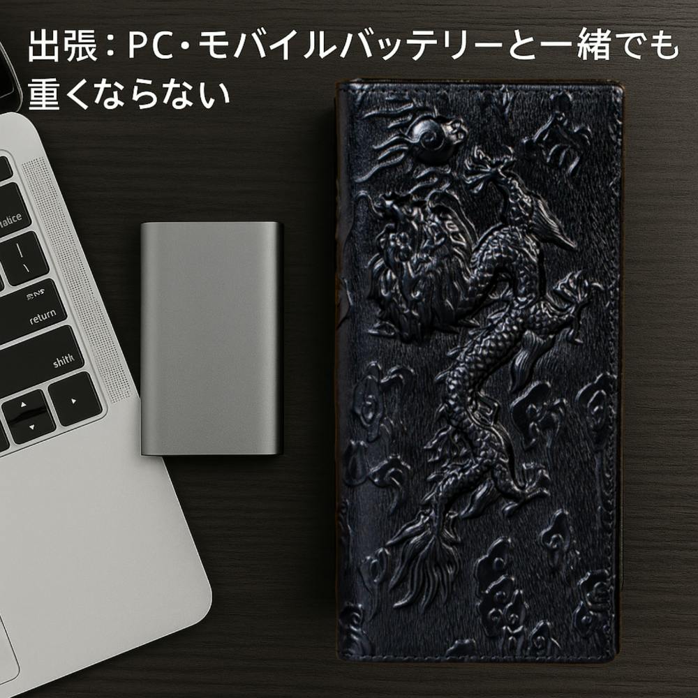 長財布=重い、という常識をくつがえす軽さです。外出時のバッグやポケットの負担を減らし、会計や移動がストレスフリーに。本革の質感・立体龍の存在感はそのままに、必要十分なカード収納・札入れを備えた“軽量設計”。通勤・出張・旅行、どんなシーンでも軽いからこそ毎日使える。「持ち歩くと気持ちが軽くなる」— それがこの龍財布の実力です。