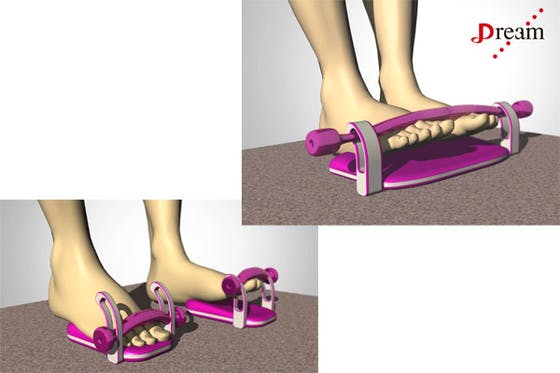 ひとたび転倒すれば、長い療養・介護を必要とする事態にもなりかねません。つまづきにくい脚づくりのため、すね筋を鍛えるエクササイズ器具を、考案することにしました。