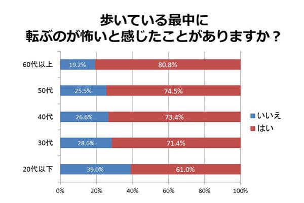 意外なのが、すでに30代から7割強が何らかの「転ぶことへの怖れ」を歩行時に、すでに感じているということ。