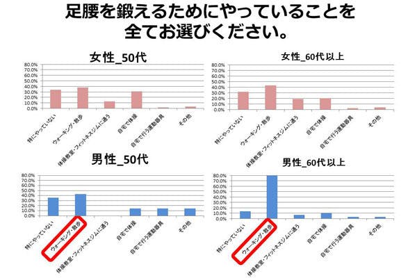 足腰を鍛えるためにやっていることについてあてはまるものを尋ね、男女別に50代・60代を集計したところ、男性では圧倒的に「ウォーキング・散歩」と答えた割合が第1位。