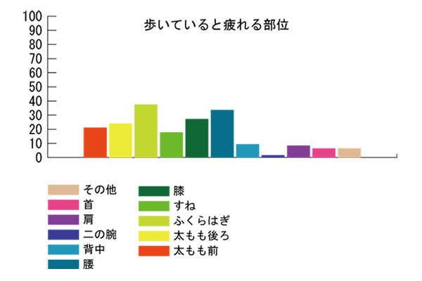 2017年6月に、ららふるの運営会社 株式会社ドリームが調査した「ウォーキングに関する調査」では、歩いているとどの部位が疲れますか?という質問に対し、第1位「ふくらはぎ」・第3位「膝」という足の部位に割り込むようになんと第2位が「腰」。腰を痛めやすい猫背姿勢のまま歩いている可能性や、脚の引き上げ・つま先の引き上げと蹴り出しがをしっかりできていない可能性が考えられます。