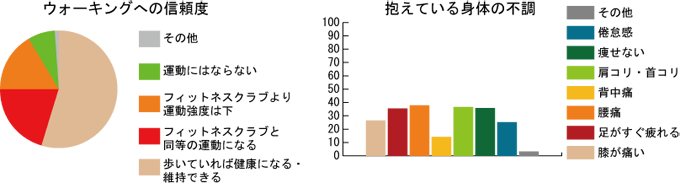ところが、普段抱えている身体の不調について尋ねたところ、肩コリ・首コリや背中痛とともに腰痛が40%近く。足がすぐ疲れるという割合も30%強に上りました。
