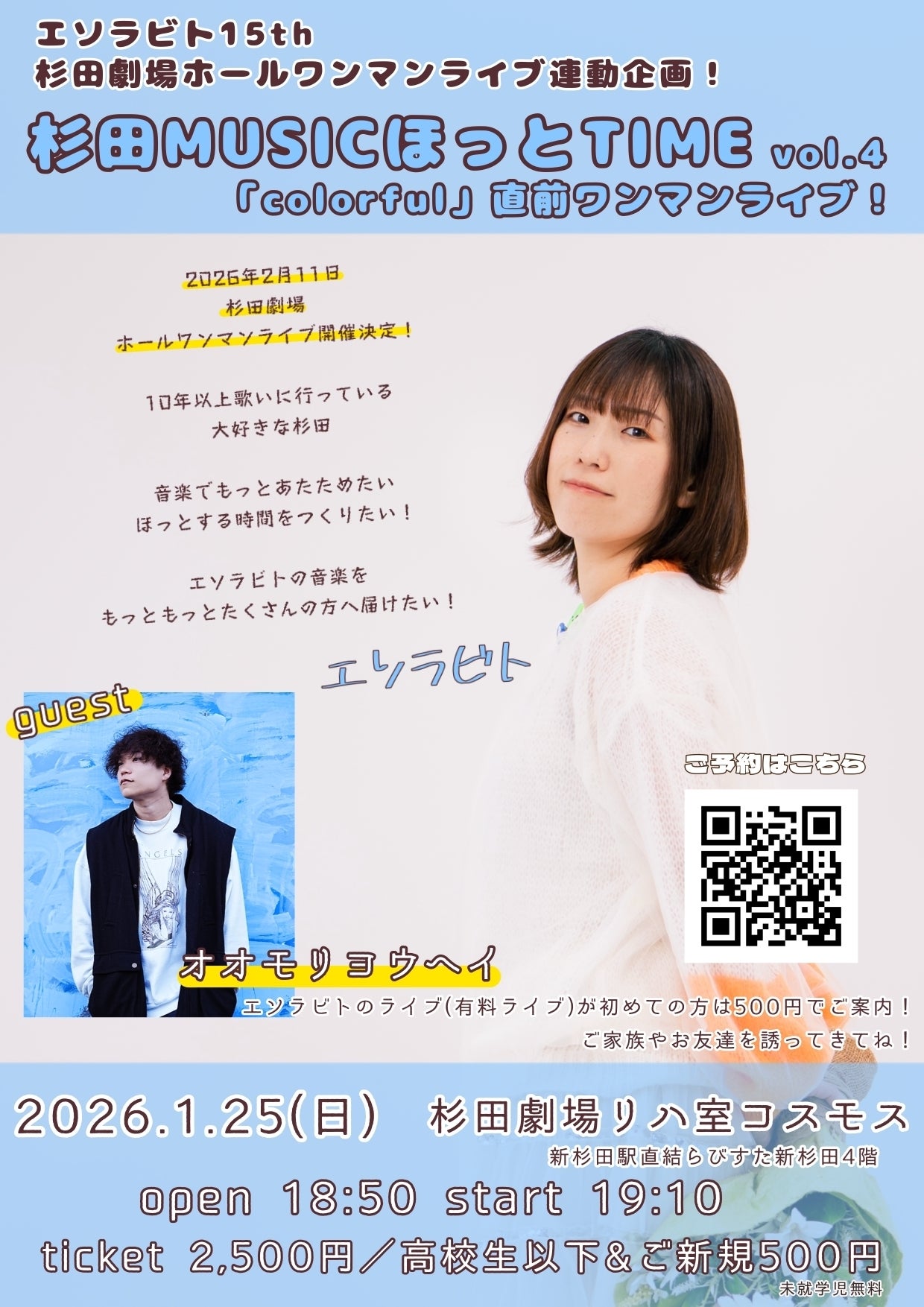 2026/01/17 14:05こんにちは!エソラビトです!杉田劇場ホールワンマンまで1ヶ月弱!今日しかない今日を大事に活動しています。さて、本番は一緒に歌っていただきたい曲が2曲!「colorful」https://youtu.be/rPql_Ci6RPg?si=k3jwiFdZtYRWGQZF「空へ」https://youtu.be/zEQOrSzZ0jo?si=qtj8DNINDp0zMHiXこちらの動画で練習してみてくださいね!そして、今月ホールワンマン前ラストの連動企画ワンマンがあります!2/11は杉田劇場ホールなのですが1/25はその下の階の練習室コスモスで開催します!(2/11のバルーンアートワークショップの場所と同じ場所ですね)この日は「colorful」「空へ」も歌います!そして2/11にゲスト出演してくれるオオモリヨウヘイ君も歌いにきてくれます!豪華〜!!さらになんと!エソラビトの有料ライブを初めてご来場くださる新規のお客様は500円でご案内しています〜!2/11のライブのチケット買った(予約)したけど、まだエソラビトの箱ライブ見たことない!きたことない!そんな方も500円でホールワンマンライブ前にエソラビトを体験できちゃいます!是非、ホールワンマン前にどうぞ!!心よりお待ちしてます!◇ライブのご予約https://esorabito.com/reserve(1/25を【一般】または【新規】を選択ください)あとすこし!!!!がんばるぞ!! もっと見る